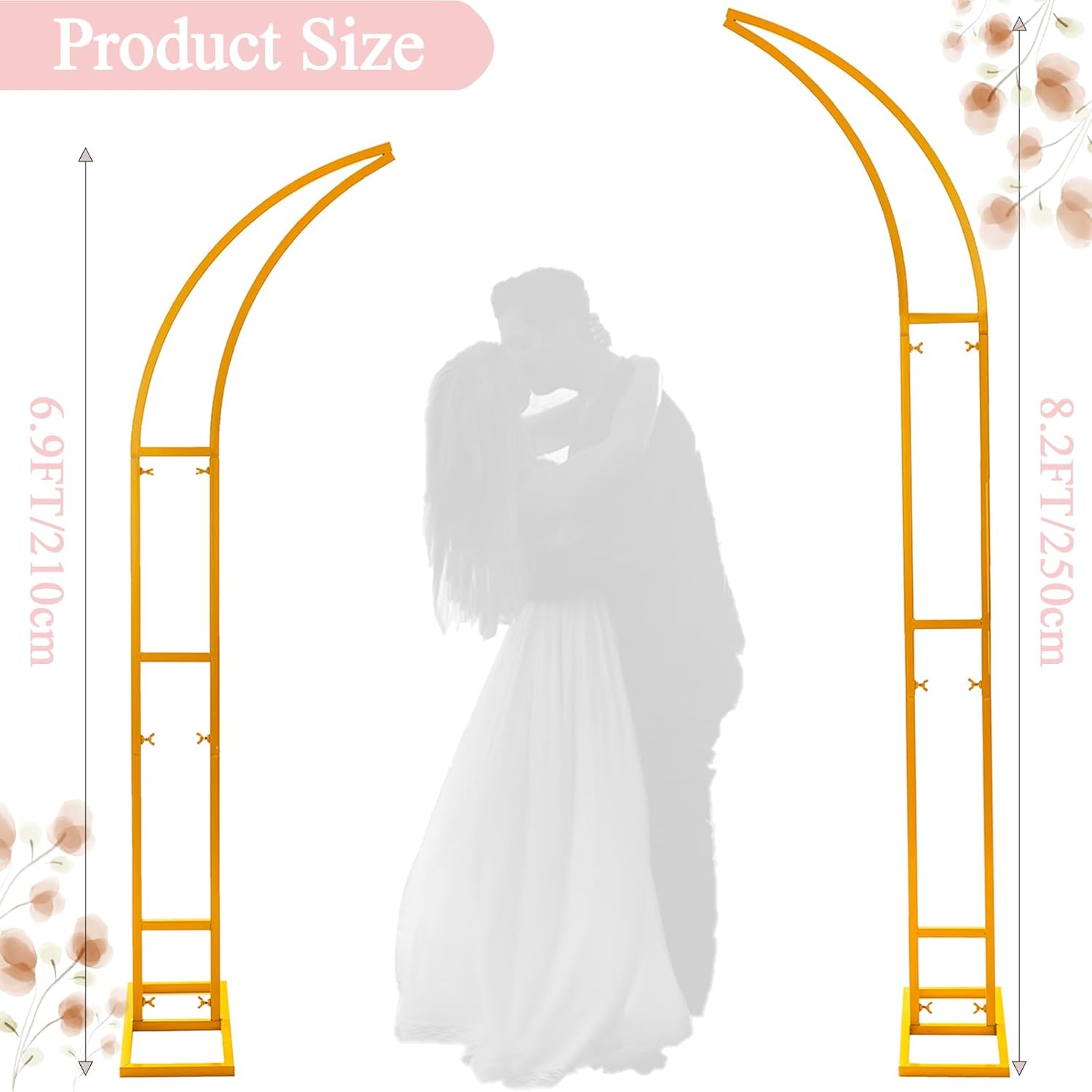 SATBIR 2pcs Large Wedding Arch with Base Flower Stand Arch Bracket Stand Backdrop Stand For Wedding Party Elegant Decorations & Garden Climbing Plants Vines,8.2&6.9 FT-Gold