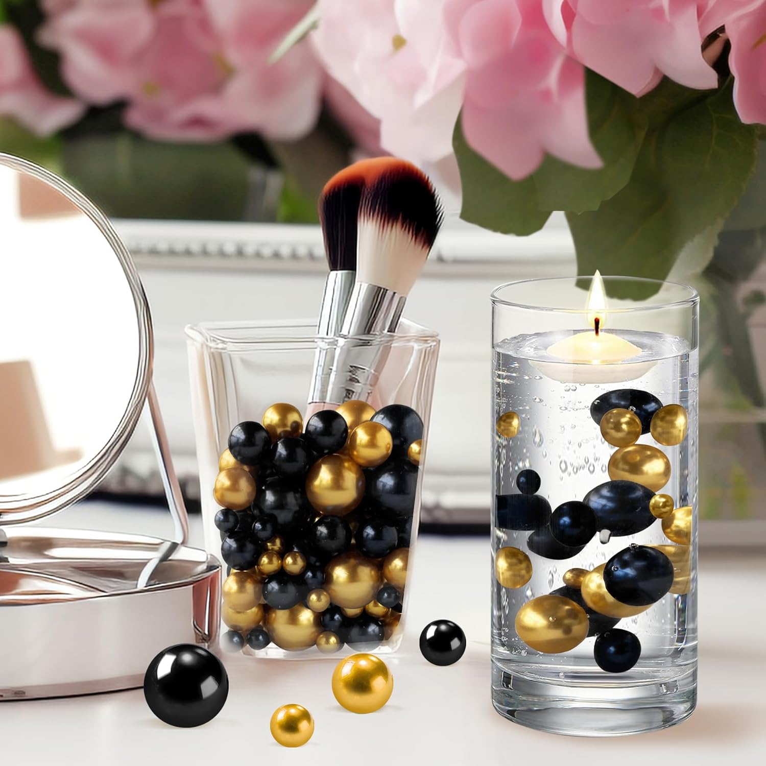 150Pcs Black&Gold Polished No Hole Faux Pearl Beads for Vase Filling Decorations, Plastic Pearls Vase Fillers, Table Scatters, Wedding Centerpiece, Home Decor, 8/14/20 mm