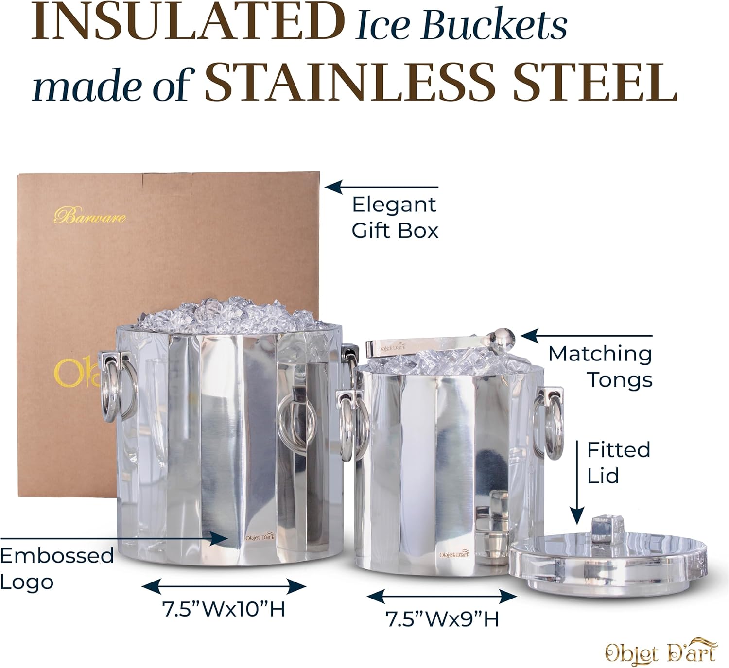 Insulated Ice Bucket for Parties by Objet D’Art, Large Ice Bucket with Scoop Tongs, 2 Stainless Steel Metal Buckets for Party, Double Walled, 2 Liters, Delphi, 7.5 x 9 x 10