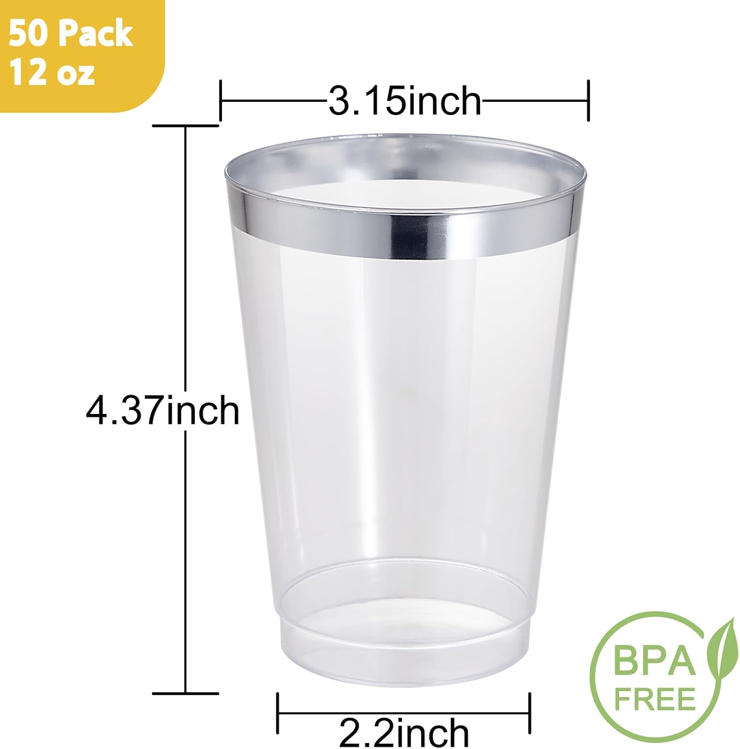 I00000 50 Pack 12 oz Silver Rimmed Disposable Cups, Heavy Duty Plastic Tumblers for Party