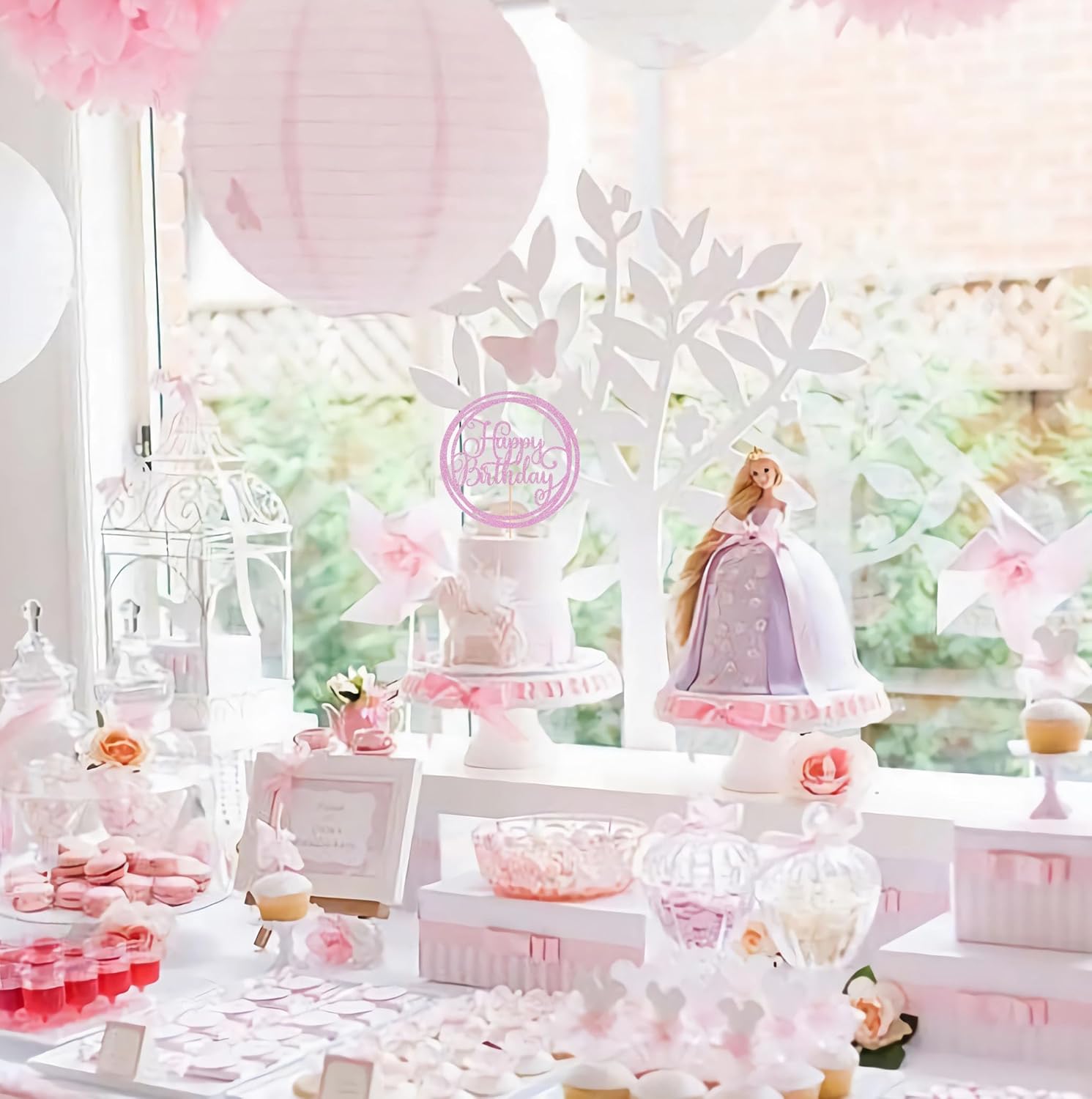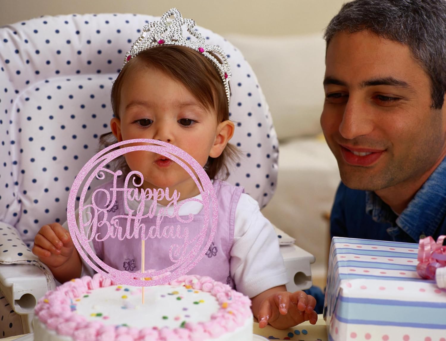 Happy Birthday Cake Topper - Pink Glitter Happy Birthday Cake Decoration Supplies for Children or Adults - Happy Birthday Cake Bunting Decor, Photo Booth Props