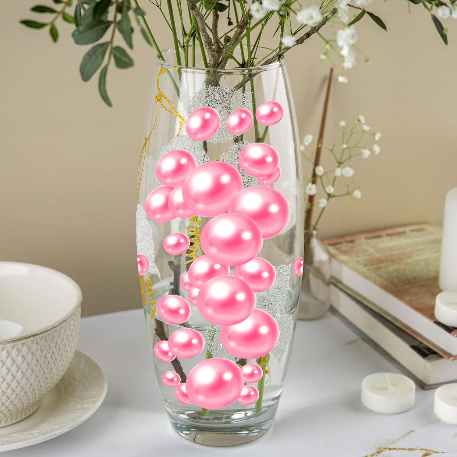 - 【Beads for Decoration】fake pearls are ideal as vase fillers, the pearl decor surprises your family, and friends, Vase Beads for centerpieces are a great romantic and simply elegant, decorate your floral arrangements, use Vase Beads for vases no hole as vase fillers, candle plate decorations, give you a sense of beauty and magnificence. decorative pearls perfect for wedding and family graduation bridal shower decorations; birthday, holiday, DIY Crafts.