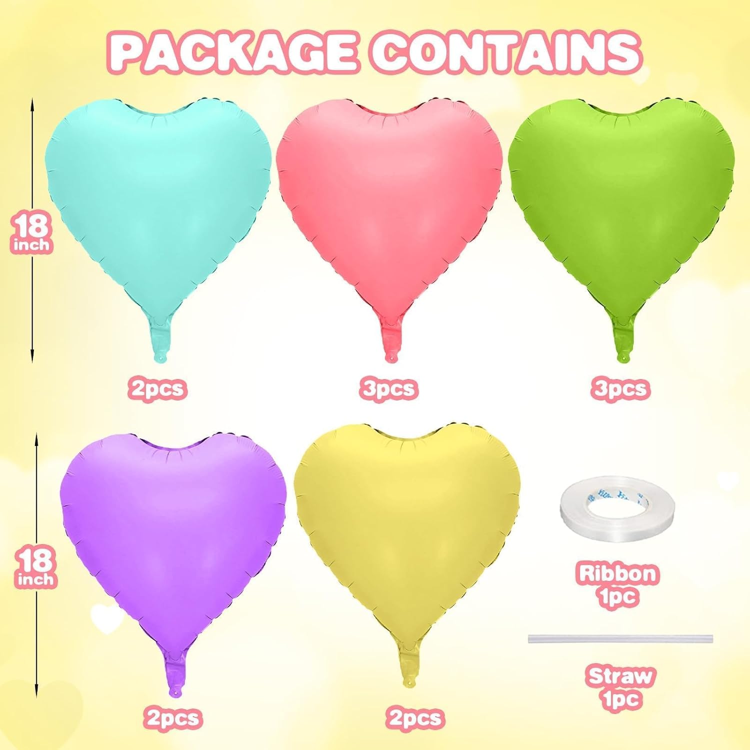 - Pastel Heart Balloons:This 18 inches heart shaped balloons includes 2* macaron purple heart balloons, 2* macaron blue heart balloons, 3* macaron pink heart balloons, 3* macaron green heart balloons, 2* macaron yellow heart balloons,1* white ribbon, 1*straw, adding romance and warmth to your celebration. These large heart balloons will be the highlight of your party decorations, creating an atmosphere of love for everyone.