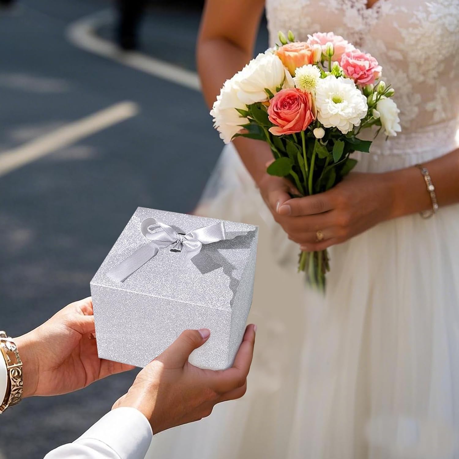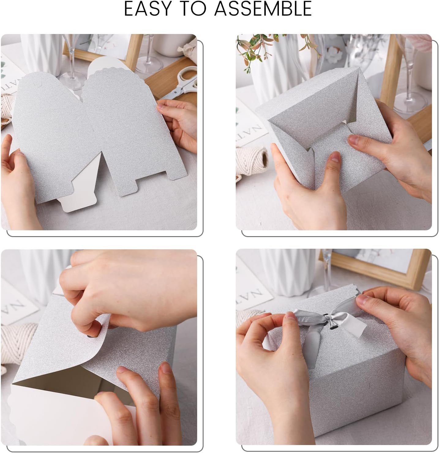 - Package Includes: You will get 10 sliver glitter folding boxes made from high-quality paper, along with 10 ribbons. Each box measures 4.7" x 4.7" x 3.5"