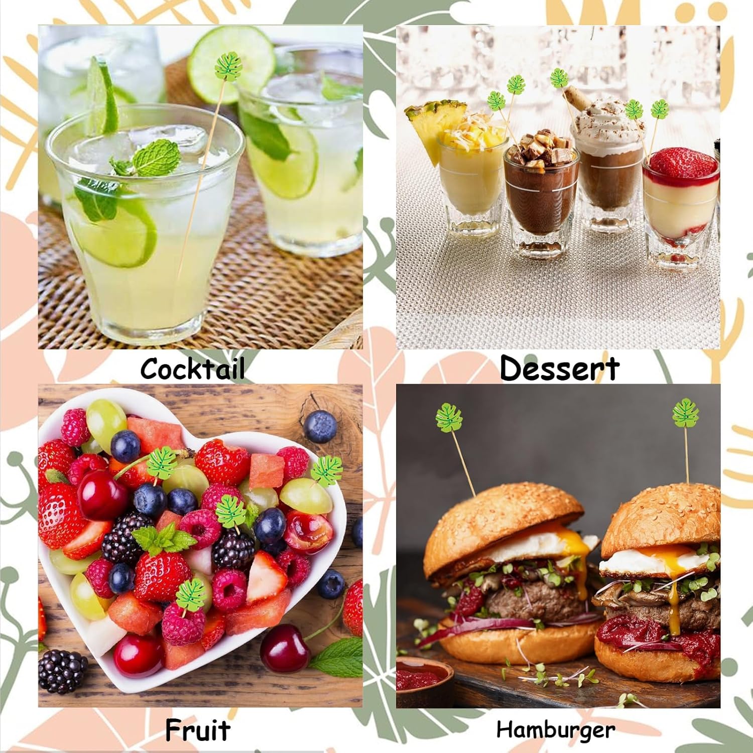 120 Pcs Monstera Leaf Cocktail Picks 4.7" Drinks Fruits Hawaiian Party Food Garnish Skewer Sticks St. Patrick's Day Decorations Supplies Cowboy Handmade Bamboo Toothpicks