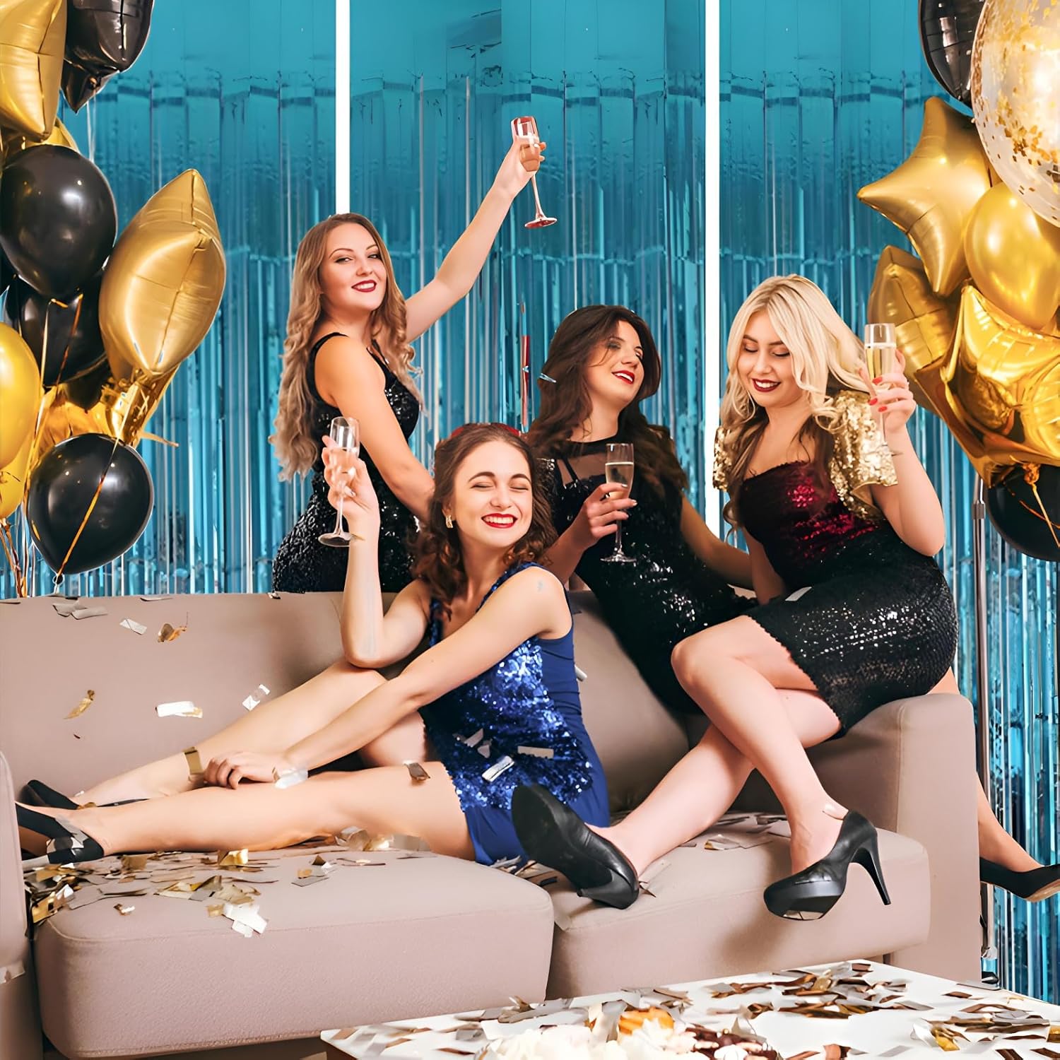 - Pair with other party decorations: Tinsel backdrop curtain can be paired with LED lights, balloons, banners, wreath, garlands, swirl streamer, tissue paper pom poms.