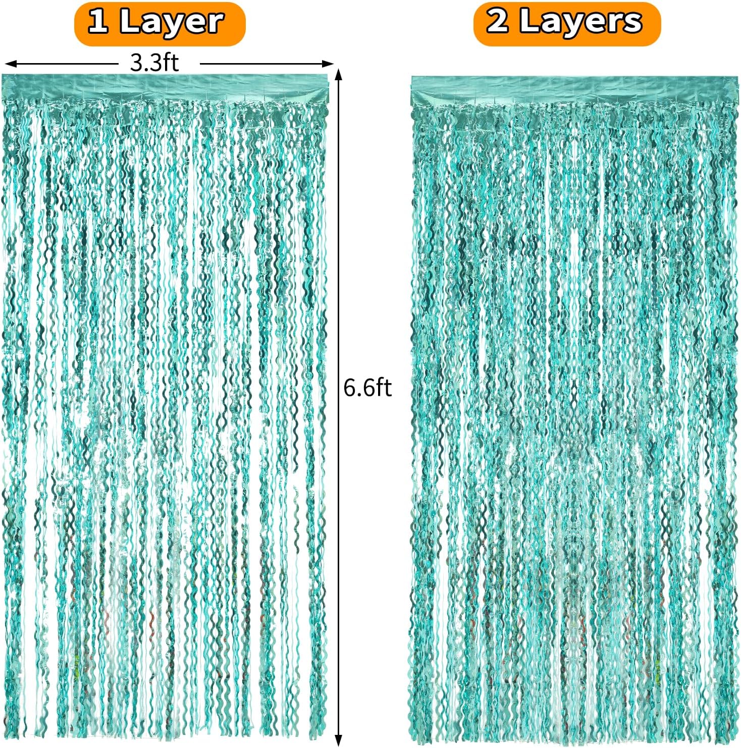 4 Pack 3.3 ft x 6.6 ft Wavy Aqua Teal Blue Tinsel Foil Fringe Curtains Backdrop - Wave Metallic Foil Curtains for Wedding Girl Princess Bachelorette Euphoria Theme Party Decoration