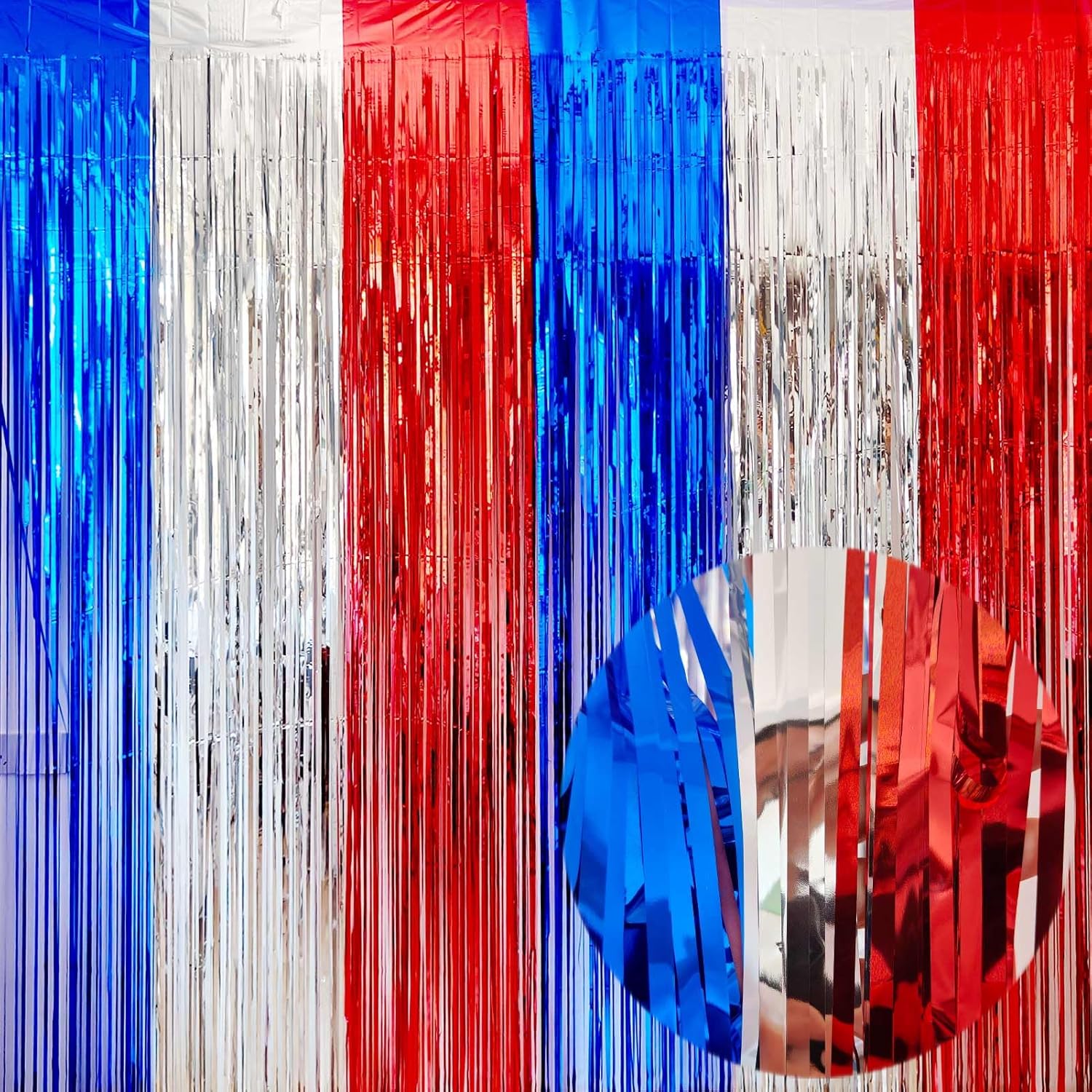 - PARTY BACKDROP DECORATIONS : The package includes 4packs red-silver-blue foil fringe backdrop curtains, each metallic tinsel curtain is 3.2ft(wide)×8.2ft(drop), wonderful accessories for decorating doorway, window and walls.