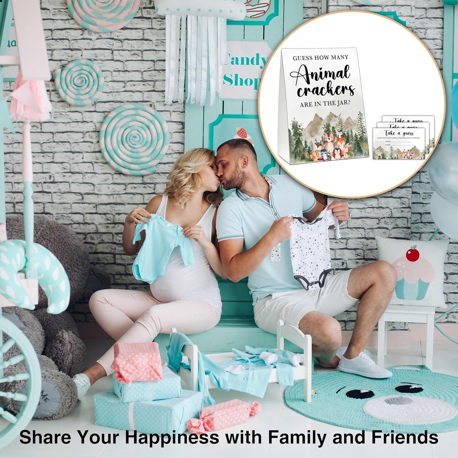 Woodland Baby Shower Game, Guess How Many Animal Crackers, Jungle Animal Safari 1 Standing Sign with 50 Cards for Gender Neutral Baby Shower - A01