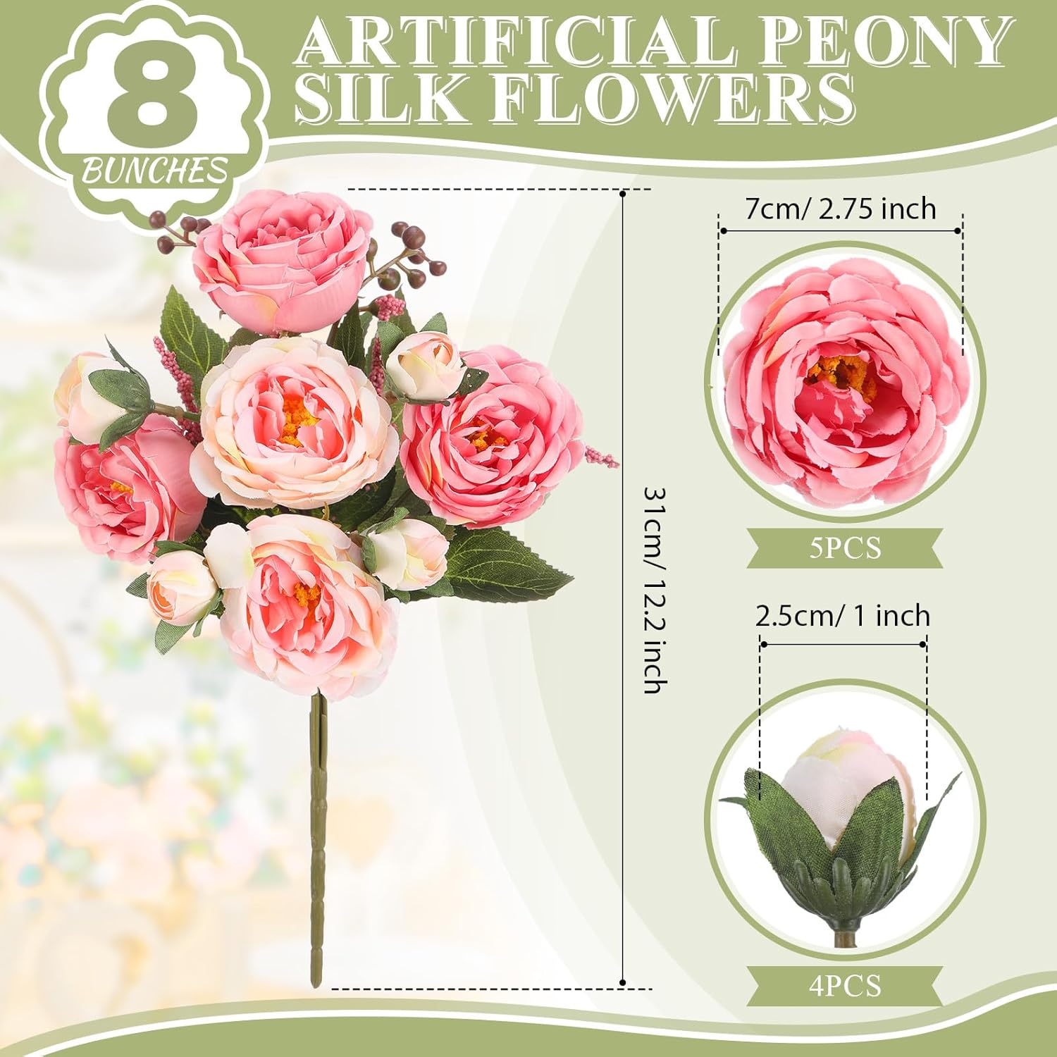 8 Bundles Artificial Peonies Flowers Boho Faux Flowers Arrangements Artificial Centerpiece Spring Bouquet Floral Wedding Decoration for Vase(Pink Color)