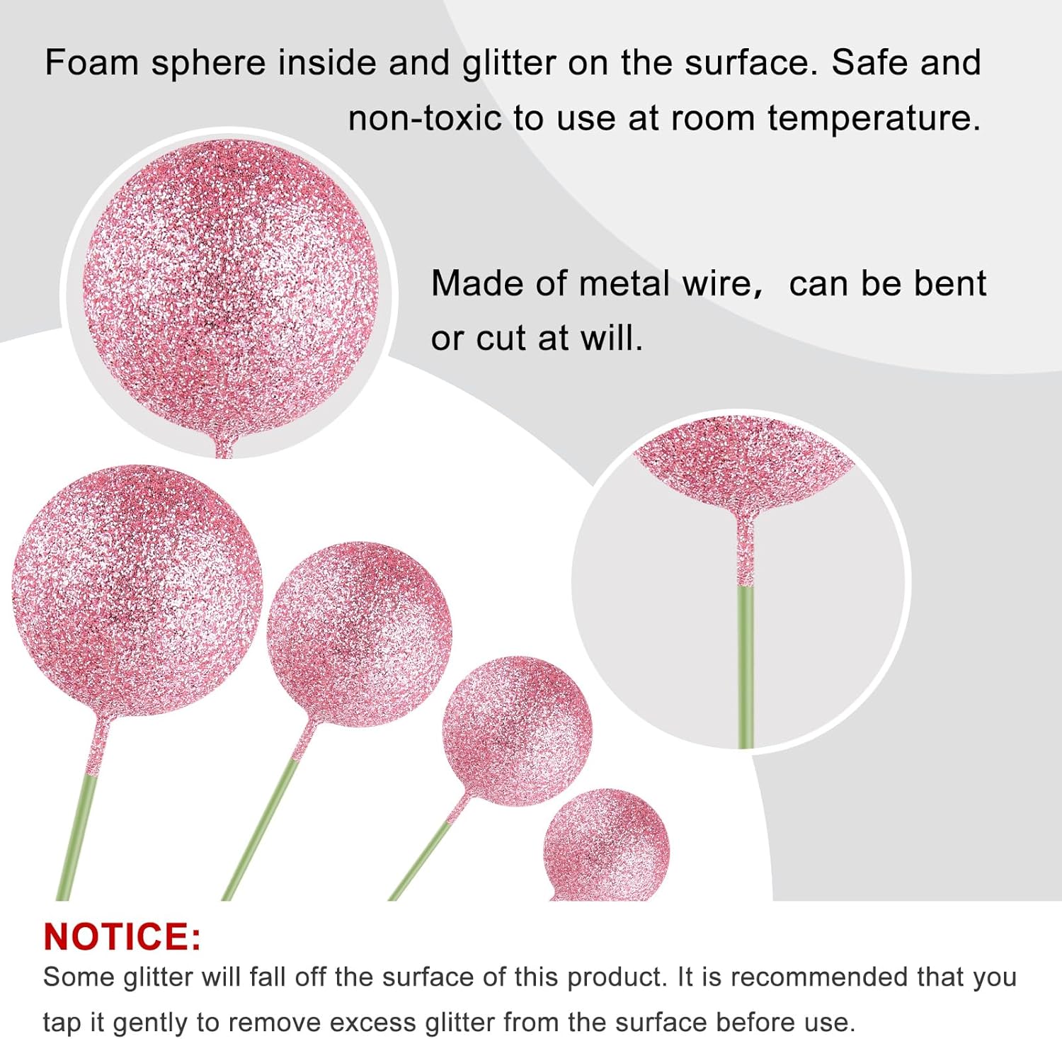 - Material: these ball decorations for cake are made of foam and wire. Safe to decorate food at room temperature, such as cake and dessert decorating use, or cupcakes, fruits, cheese and any dish and appetizer you want to decorate.