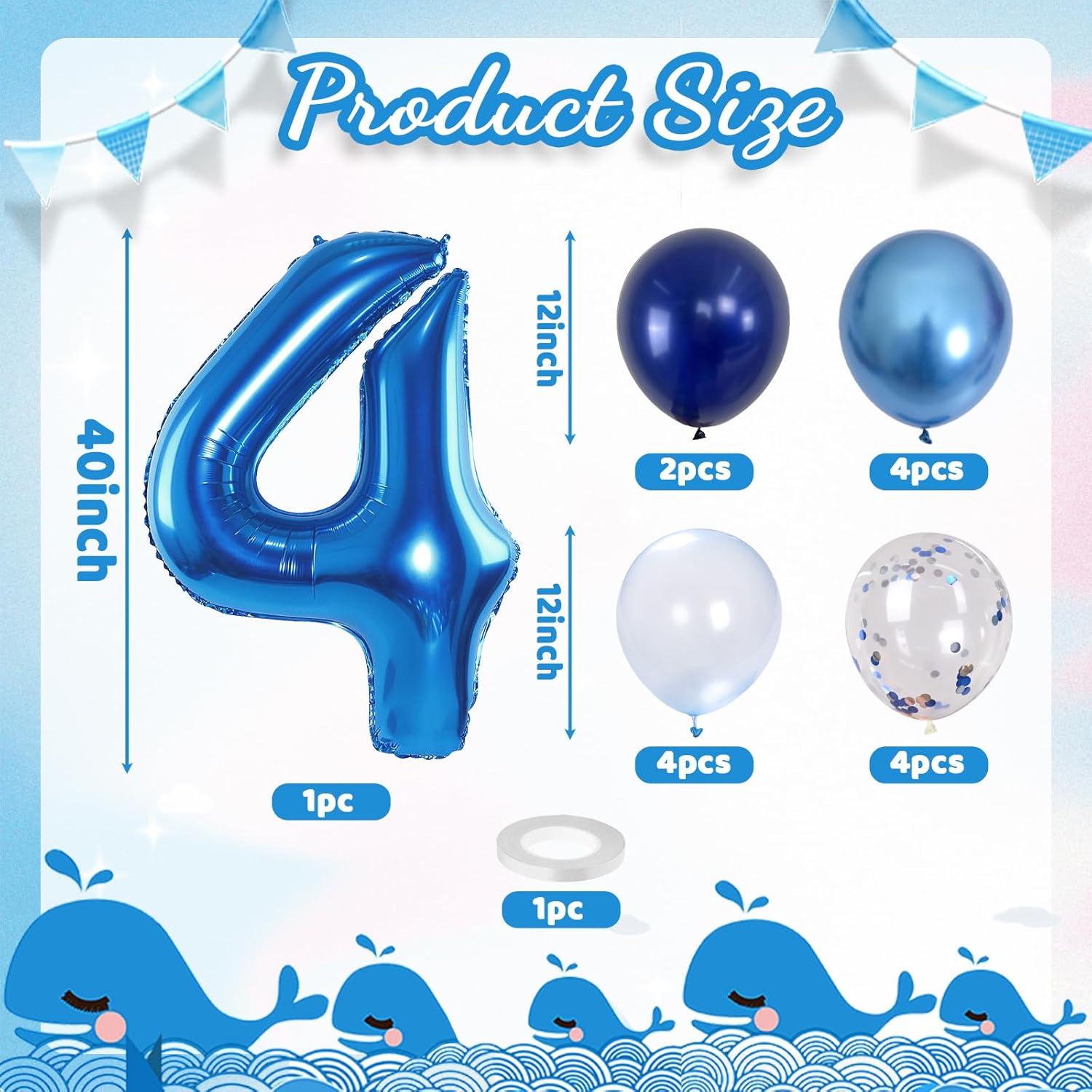 - ๐ Dark Blue Number 4 Balloon: Our package included 40 inch foil number 4 balloon(1pcs), 12 inch metallic blue balloon(4pcs), blue silver confetti balloon(4pcs), pastel blue balloon(4pcs), Light Navy Blue Balloon(2pcs), 1pcs straw and 1 roll ribbon. Simply inflate the balloon using the straw, and you're ready to party! Navy blue number foil balloons are the best for girls or boys birthday party decoration.
