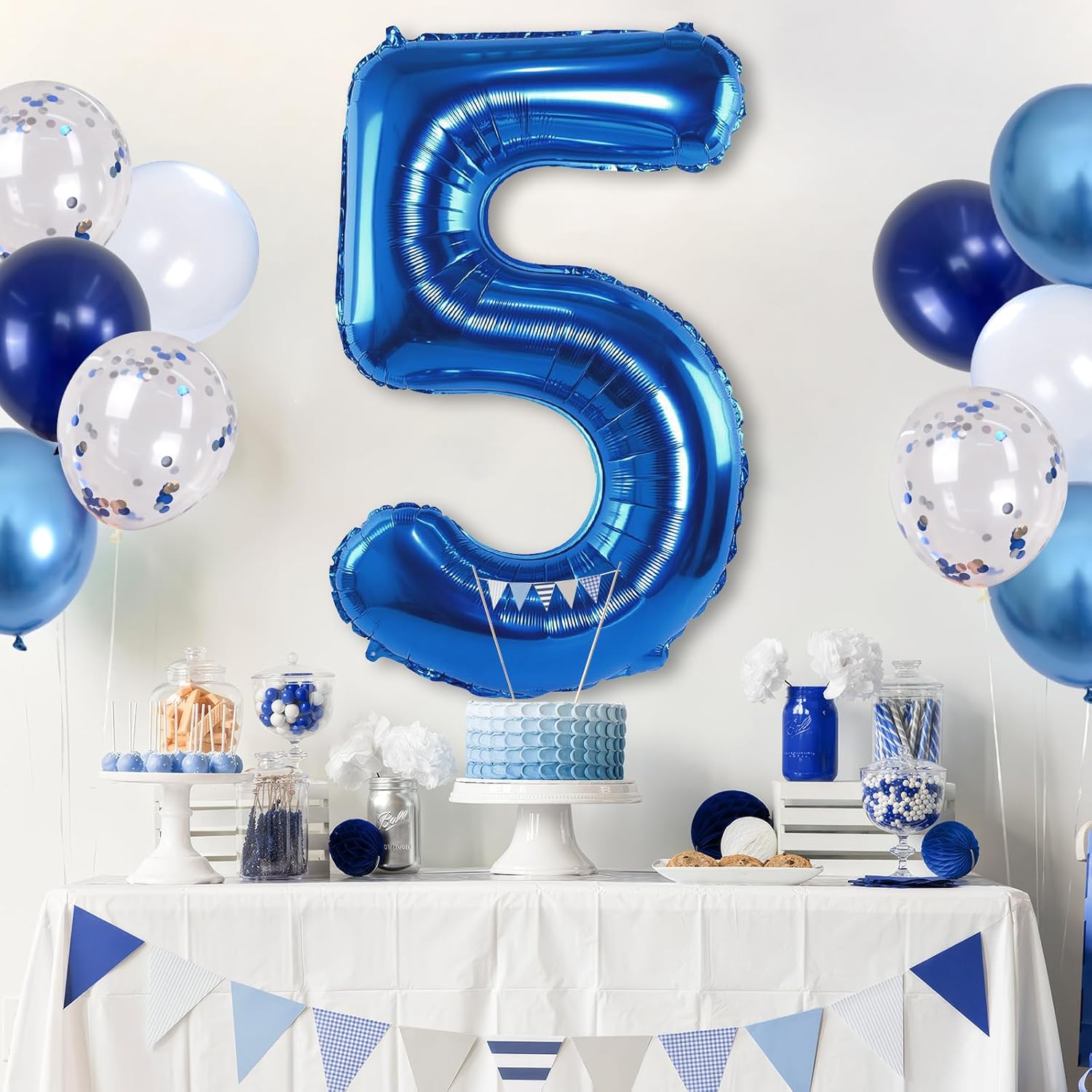 - ๐ Dark Blue Number 5 Balloon: Our package included 40 inch foil number 5 balloon(1pcs), 12 inch metallic blue balloon(4pcs), blue silver confetti balloon(4pcs), pastel blue balloon(4pcs), Light Navy Blue Balloon(2pcs), 1pcs straw and 1 roll ribbon. Simply inflate the balloon using the straw, and you're ready to party! Navy blue number foil balloons are the best for girls or boys birthday party decoration.