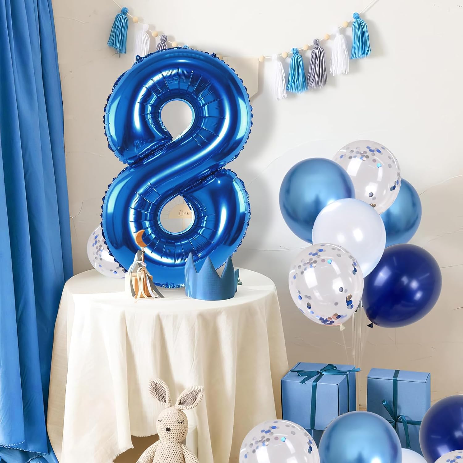 - đź’“ Dark Blue Number 8 Balloon: Our package included 40 inch foil number 8 balloon(1pcs), 12 inch metallic blue balloon(4pcs), blue silver confetti balloon(4pcs), pastel blue balloon(4pcs), Light Navy Blue Balloon(2pcs), 1pcs straw and 1 roll ribbon. Simply inflate the balloon using the straw, and you're ready to party! Navy blue number foil balloons are the best for girls or boys birthday party decoration.