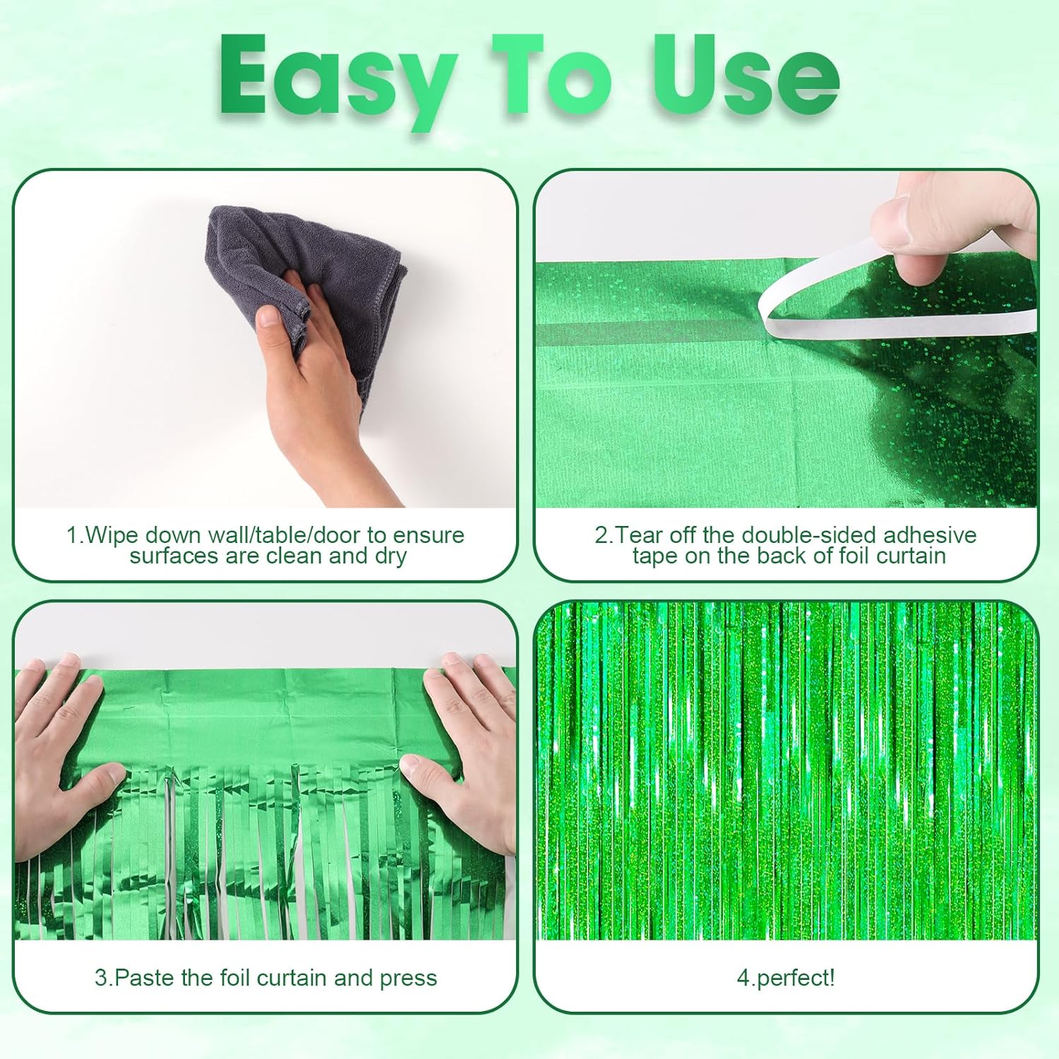 - How to Set up: Wipe down wall/table/door, ensure surfaces are clean and dry, tear off the double-sided adhesive tape, paste the foil backdrop curtains and press. Hang each individual tinsel fringe curtains in different locations for a fuller effect