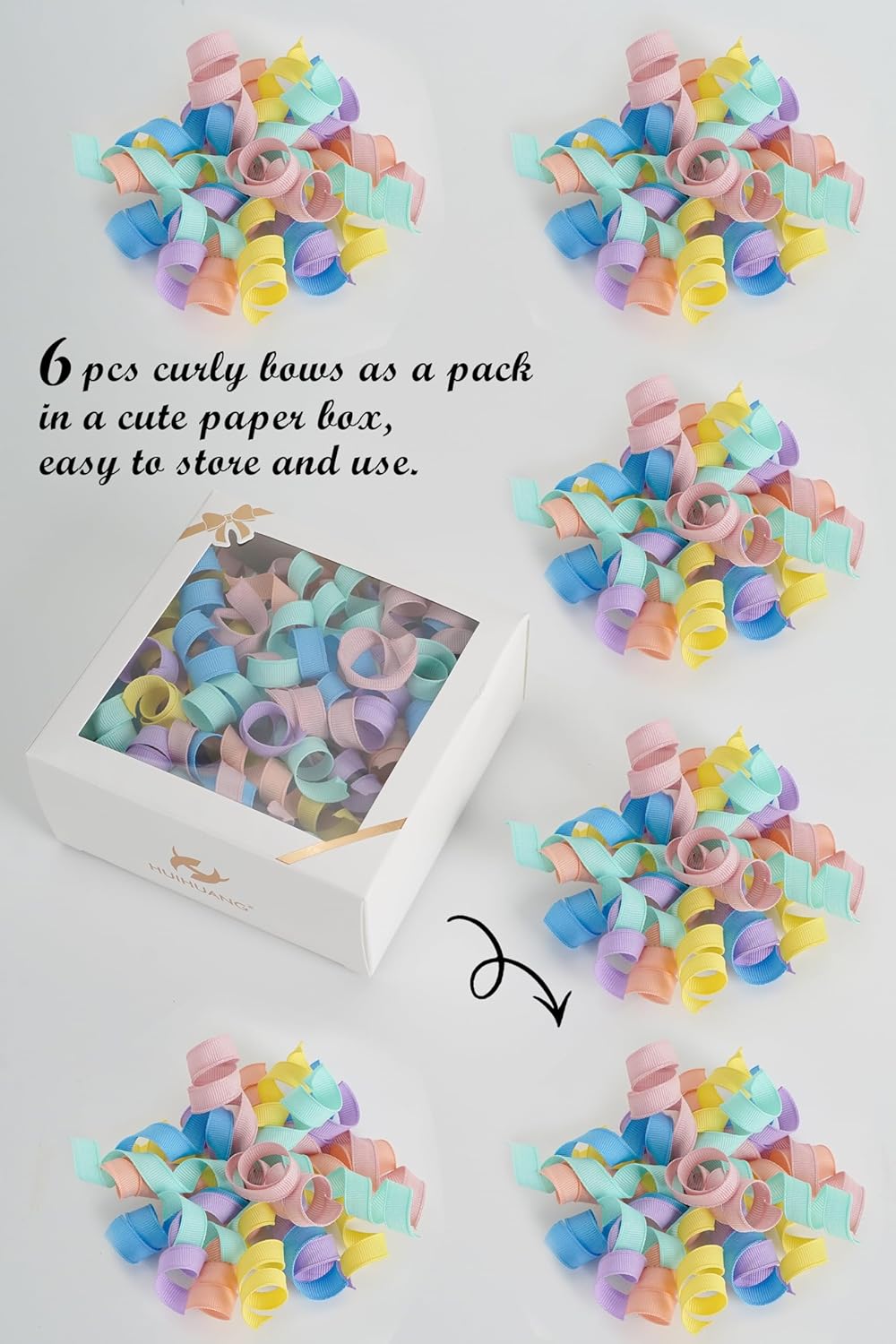 - SIZE & PACK: Each package contains 6 pcs pastel rainbow color curly bows are made of 12 strands of 3/8"(9mm) wide grosgrain ribbon that measure about 4.5~5" x 4.5~5"