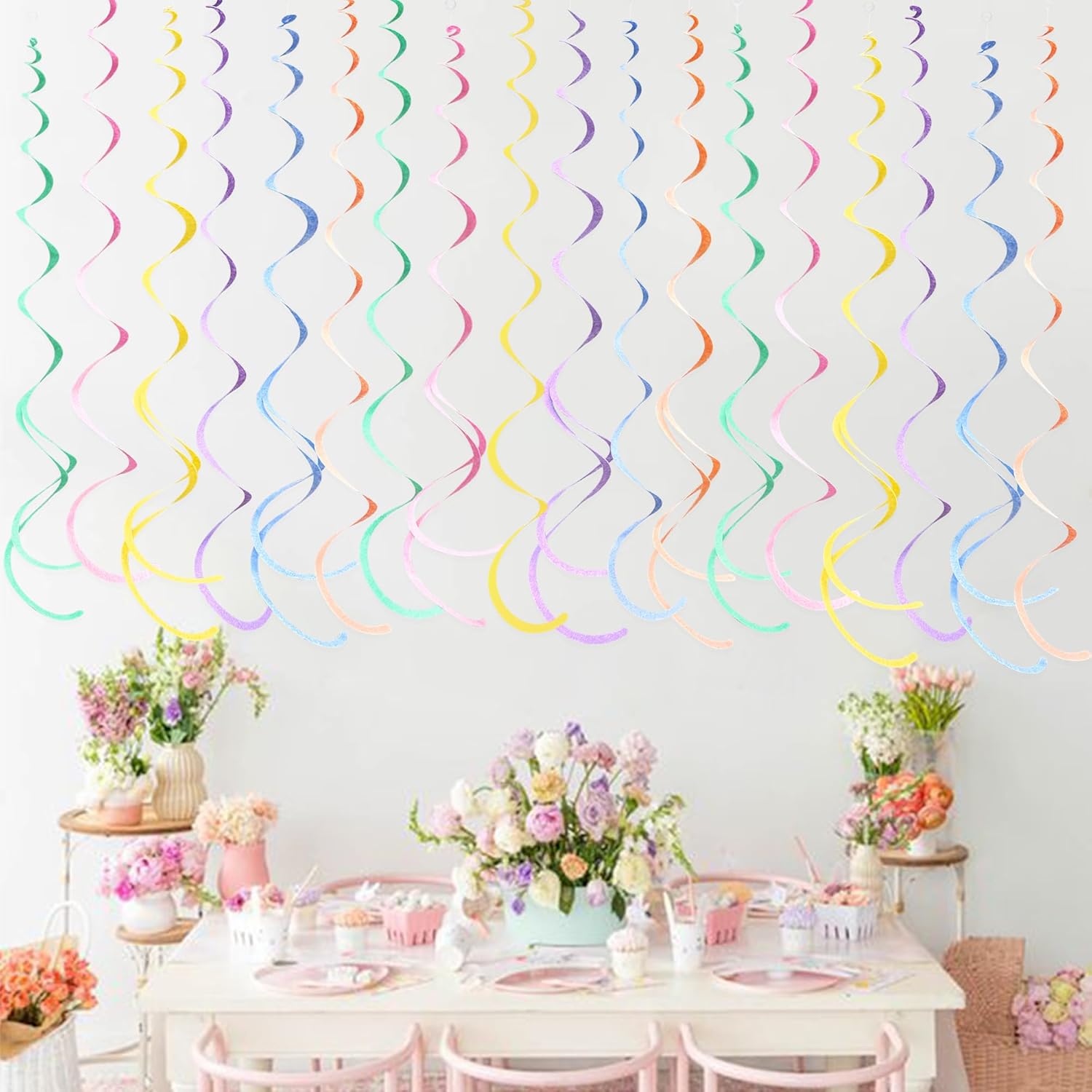 - Package Contains - 36 packs of pastel color swirl party streamer,Each swirl can extends to approximately about 2.62 feet long,Meeting daily general needs.Comes with 40 plastic hooks for hanging.