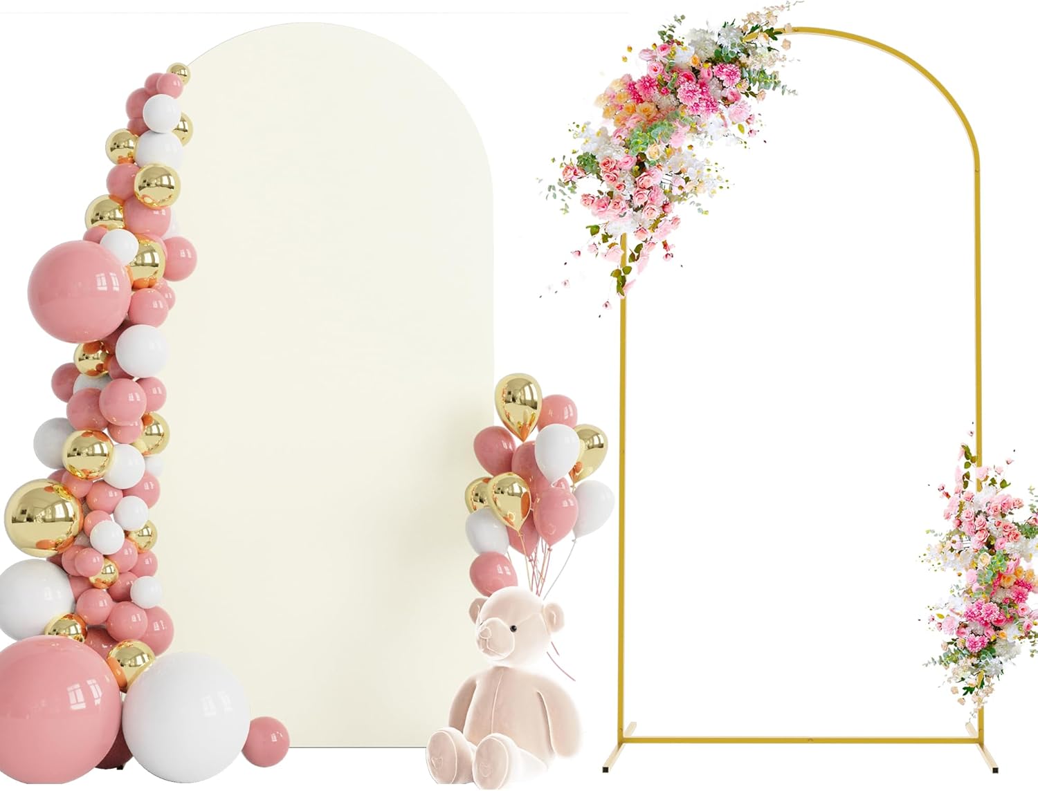 - 【Arch Stand and Covers Package】Package contains 1pcs wedding arch stand and 1pcs arch cover. Size: 6.6x3.3ft(HxW). Material: metal arch backdrop stand and spandex arch cover. Color: Ivory arch cover and gold wedding arch stand. Decorate your party with our gold arch stand and arch covers to create an epic decor for your celebration.