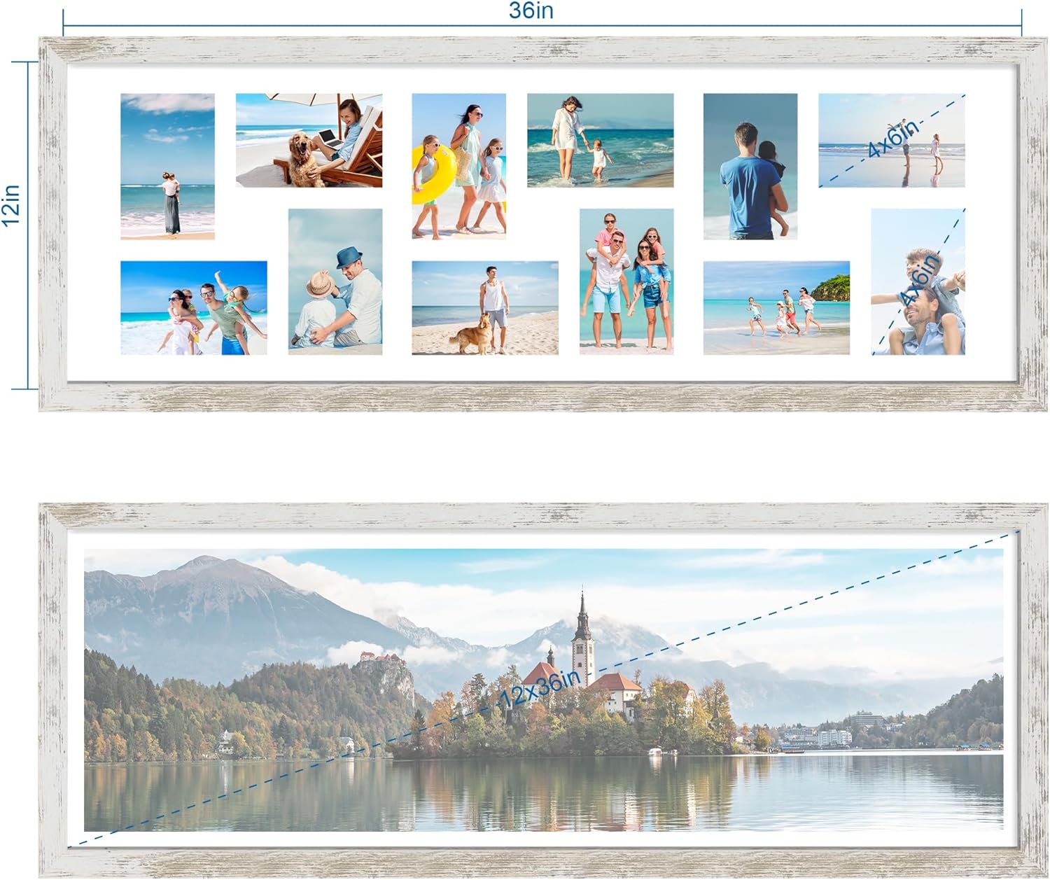 12x36 Picture Frame 2 Packs, Real Glass and Distressed White Wood Frame, Display Collage Pictures Twelve 4x6 With Mat or Pennant 12 x 36 Without Mat - Horizontal or Vertical Wall Mounting