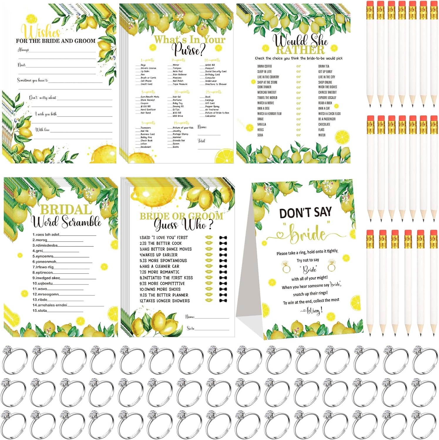 - Funny Bridal Shower Games: you will be provided with 250 pieces of lemon themed wedding games cards, 1 piece of wedding sign, 60 pieces of rings and 20 pieces of pencils, sufficient quantities can entertain your families and guests in bridal shower