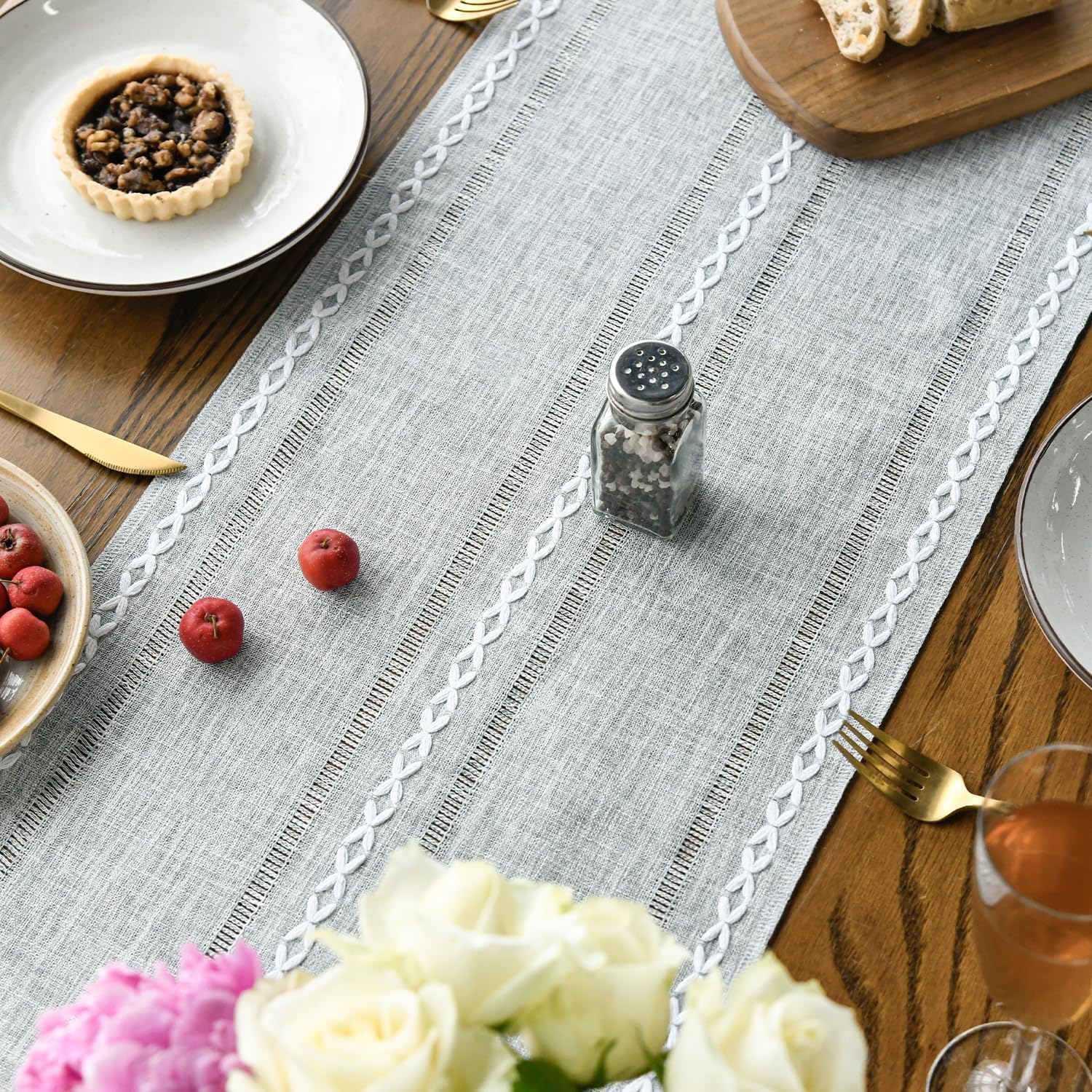 Artoid Mode Grey Rustic Cotton Linen Table Runner, Seasonal Embroidered Hollow Kitchen Dining Table Decoration for Home Party Decor 13x72 Inch