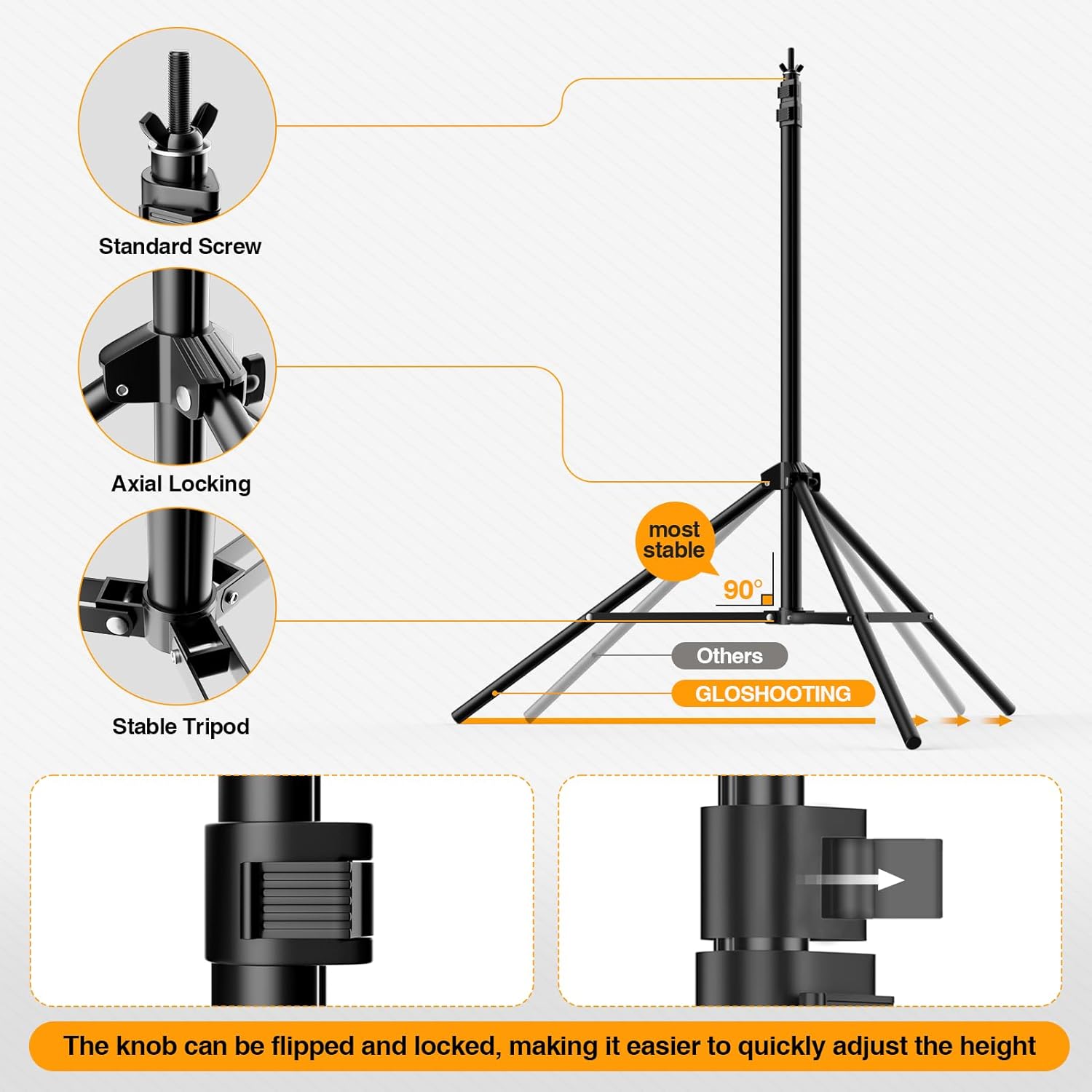 - 【Packaging Contents】(2) x 10 ft Adjustable tripod stand, (2) x 5.3 ft Retractable crossbars, (6) x Clamps, (2) x Sandbags, Carrying bag, Manual. Gloshooting provides 1-year free warranty for all parts.