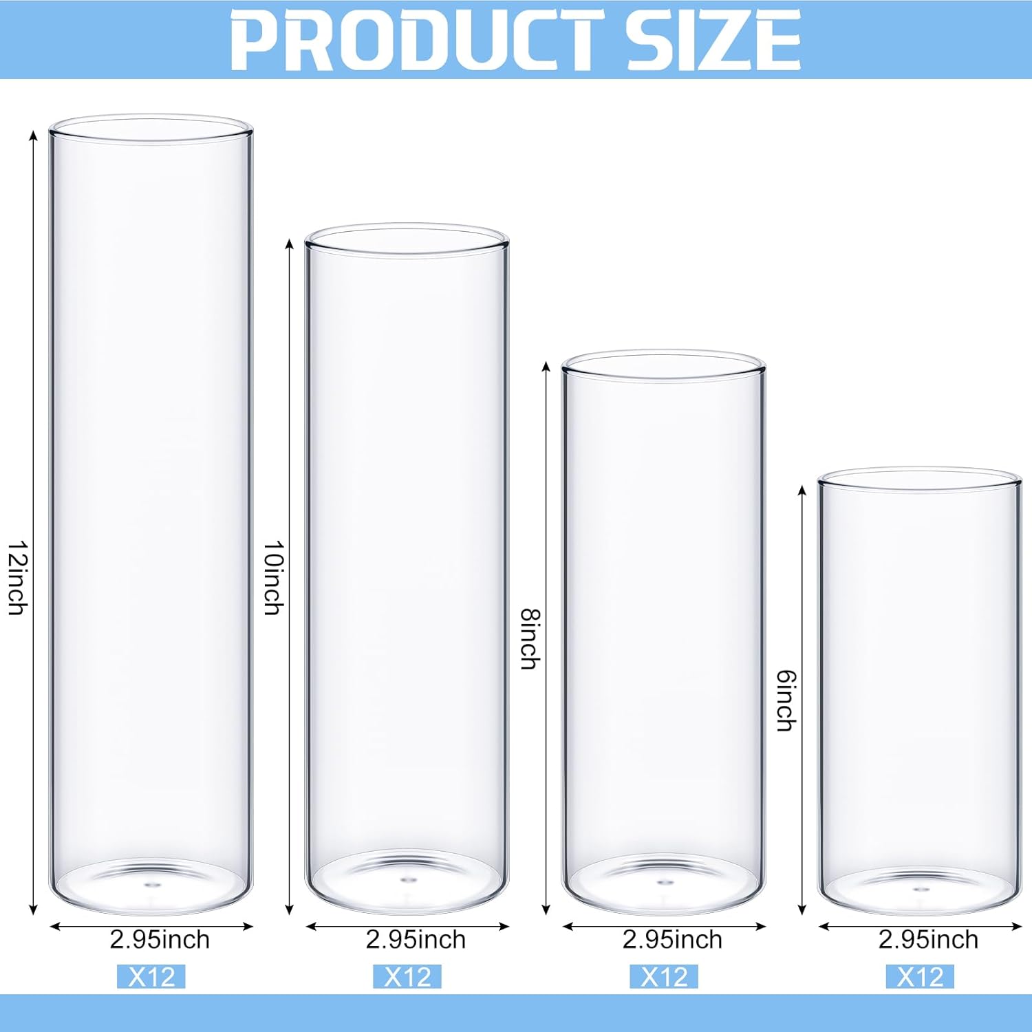 - Assorted Size: per glass cylinder vase for centerpieces measures 2.95 inch in diameter, and there are 4 kinds of height available, 6 inch, 8 inch, 10 inch and 12 inch, to meet your decoration needs for various occasions