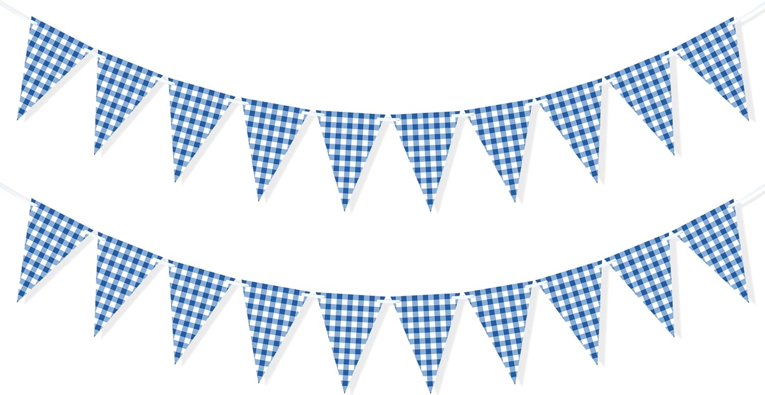 - The blue checkered triangle flags are made of quality paper material, DOUBLE-SIDED printing make the banner more special, the picnic party banner is 9.8 feet long and each triangle flag is 5.5 x 7.8 inches, each string contains 10 triangle flags, total 20 flags.