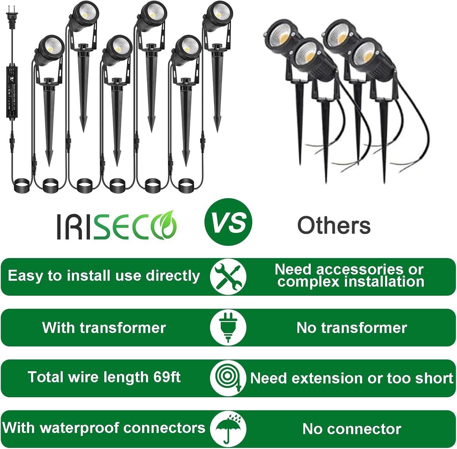 - 【6 in 1 Landscape lights, Plug and Play】-IRISECO low voltage landscape lighting kit includes 6 LED landscape spotlights, 1 transformer, 6 ground stakes and cables(Total length 69 feet). No need to buy extra transformers to save money, simple to install, connect the power cable and simply plug it into the ground or mount it on the wall with the supplied screws and it is ready for use.