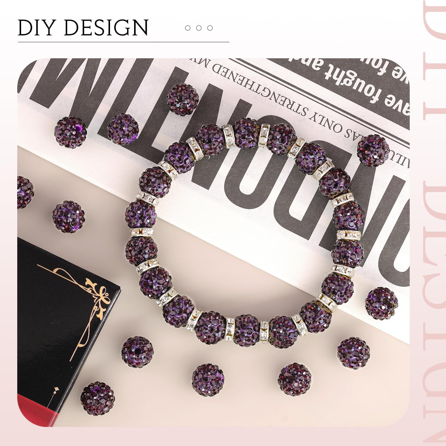 100pcs 10mm Rhinestone Beads for Jewelry Making, Dark Purple Shiny Round Shamballa Disco Beads Bulk, Sparkle Crystal Clay Christmas for Bracelet Baseball Necklace Earring Crafting and DIY
