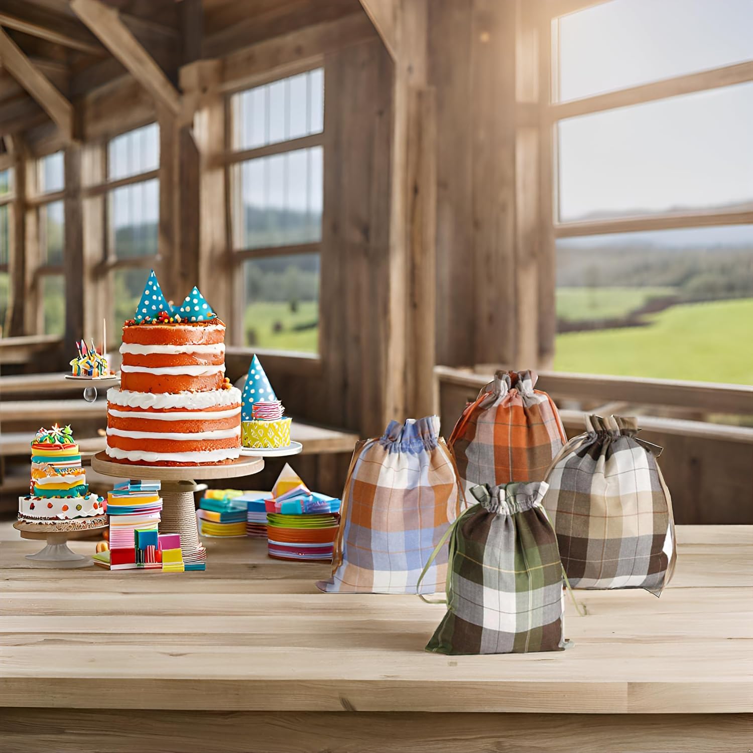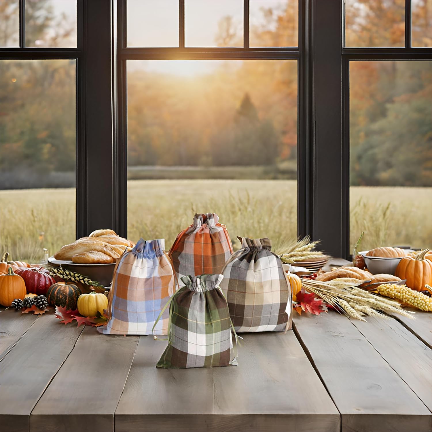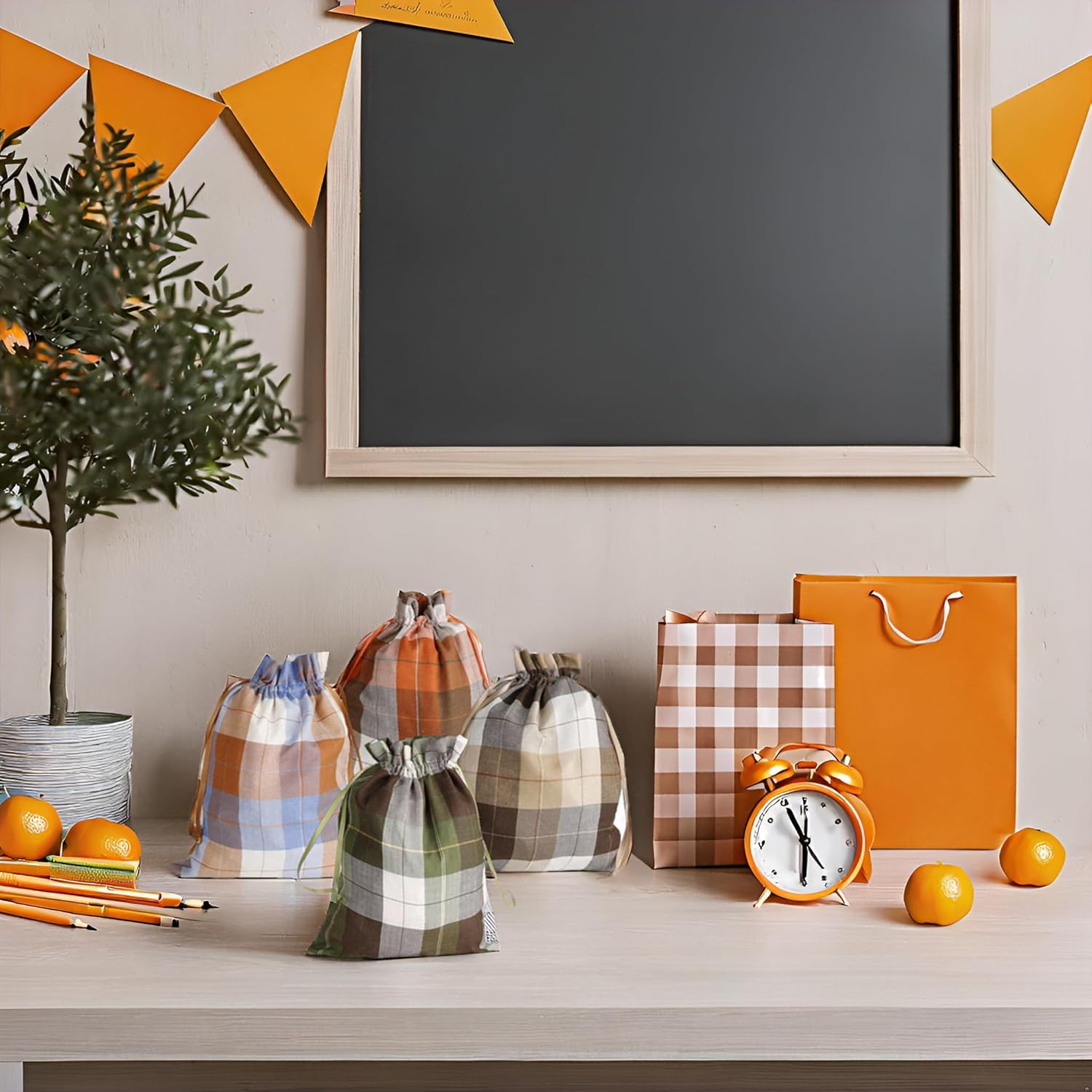 Large Fall Burlap Bags with Drawstrings - Orange Buffalo Plaid & Sage Green Gingham Sacks - Reusable Brown Pouch for Thanksgiving Party Gift Wrapping Goodies (4 Colors, 12x16 inch)