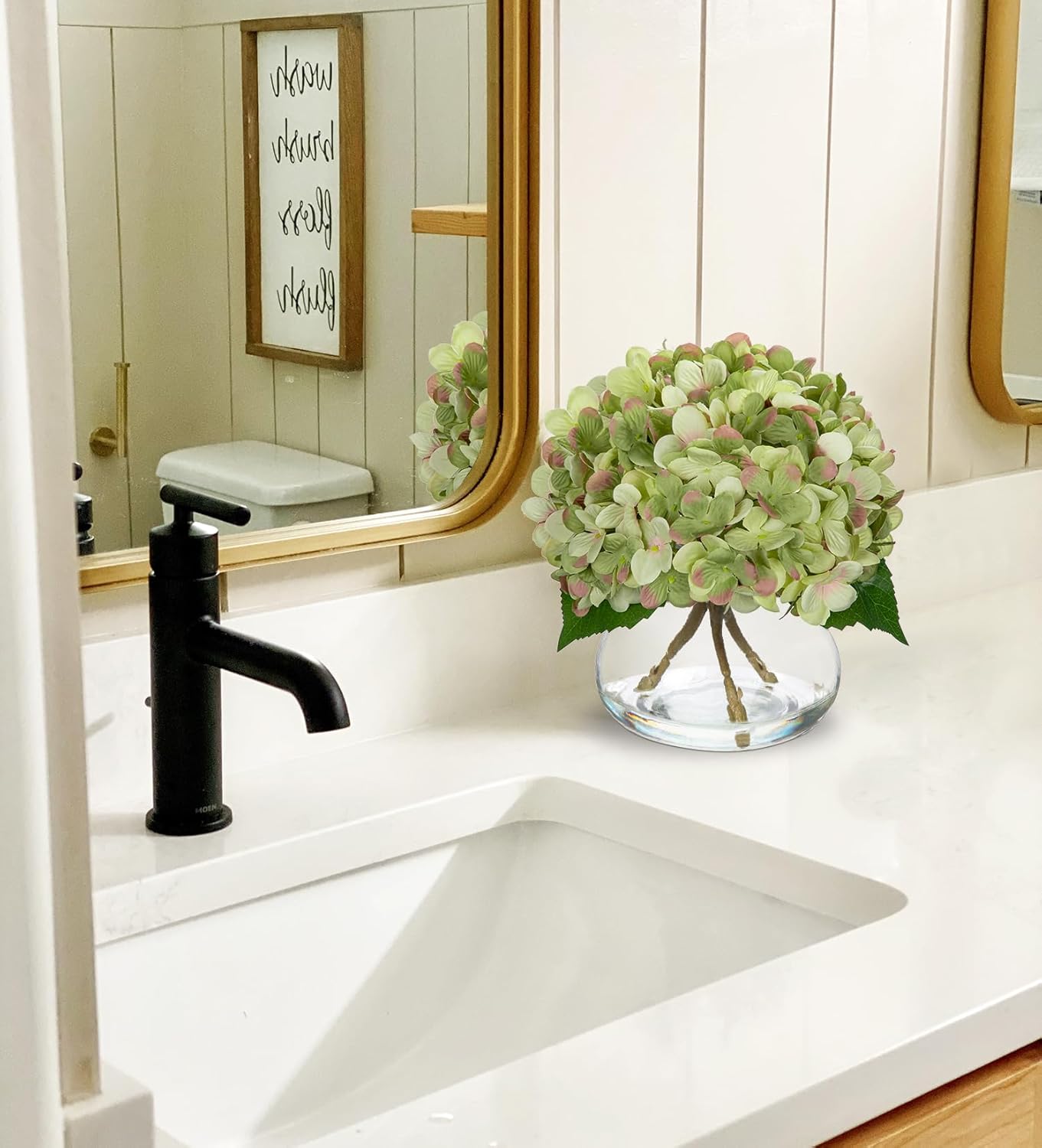 - 💐【Realistic & Elegant】Artificial hydrangea flowers with glass vase suits look so beautiful, unique craft design, brings different visual enjoyment to your home, create a romantic atmosphere, make you happy every day. Faux water on the vase adds to the pulchritude and realism. More realistic because of the details!