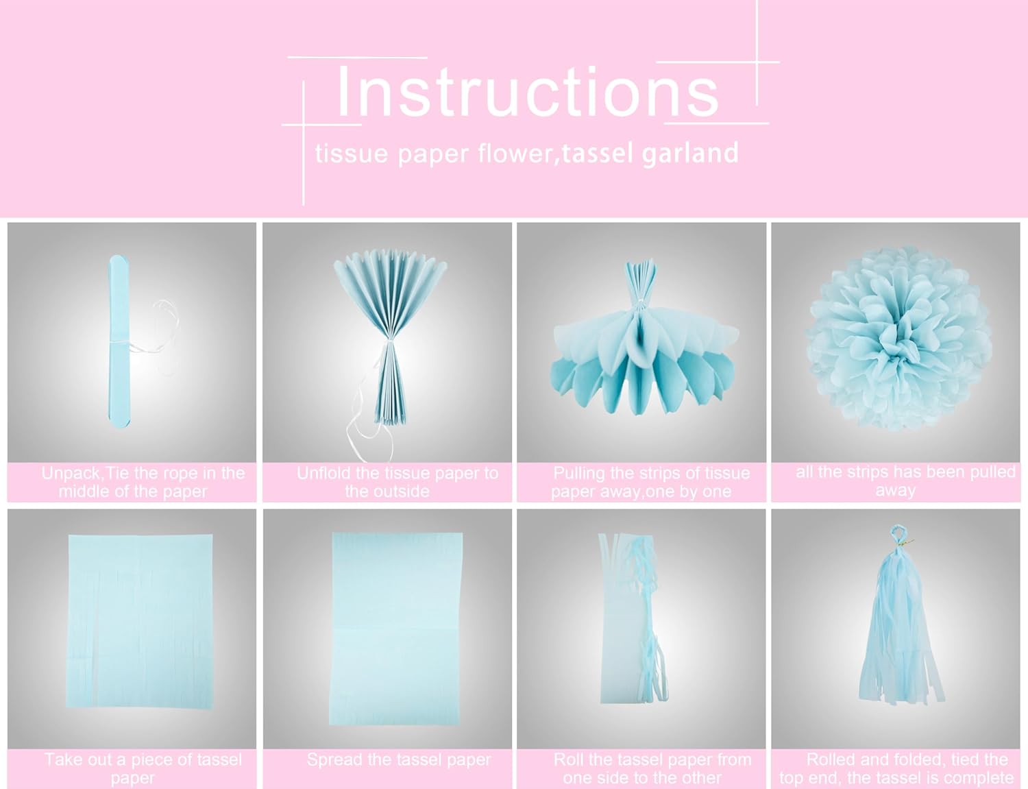 - Included Components : 15pcs tissue paper tassle garland, 1pcs paper banner, 1pcs party streamers, 3 colors: White Blue Pink, 6pcs tissue paper pom poms 15pcs tissue paper tassle garland, 1pcs paper banner, 1pcs party streamers, 3 colors: White Blue Pink, 6pcs tissue paper pom poms