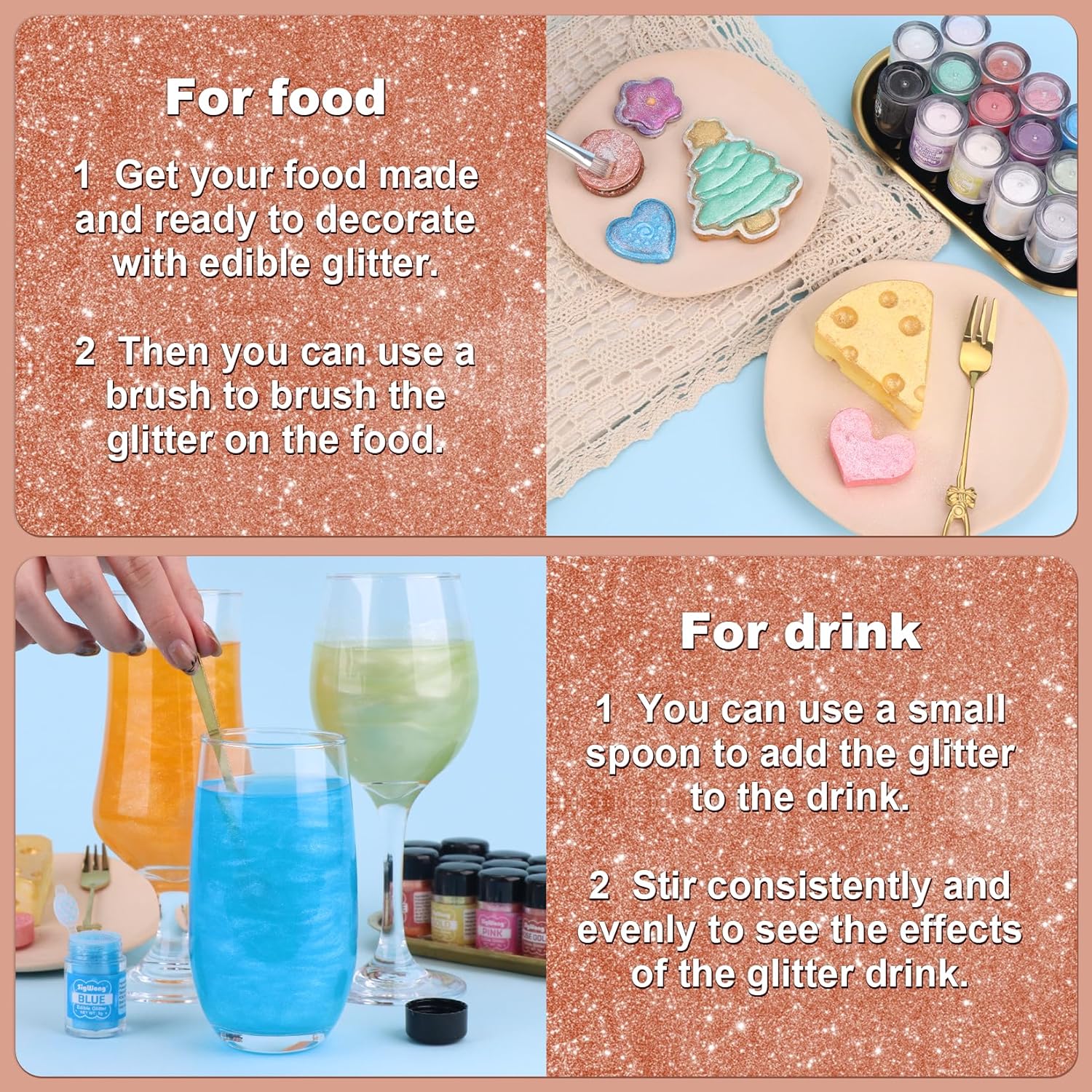 - 【Edible Glitter】: We offer edible glitter in a variety of colors, so you can match them to your party theme or personal preference to add a gorgeous shine to your drinks or baking!