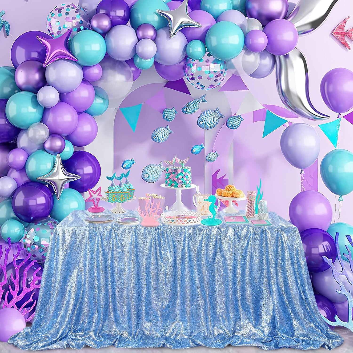 - Premium Blue Mermaids Party Decorations: This glitter tablecloth is made of 3MM round high-density sequin material with a mesh fabric backing. Matching the same or different colors can achieve unexpected effects!