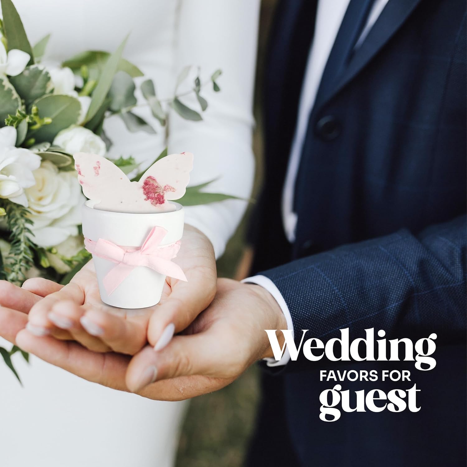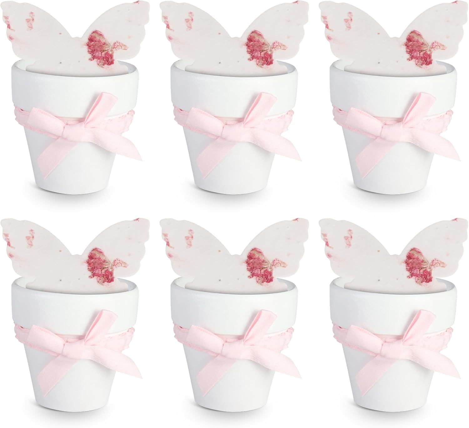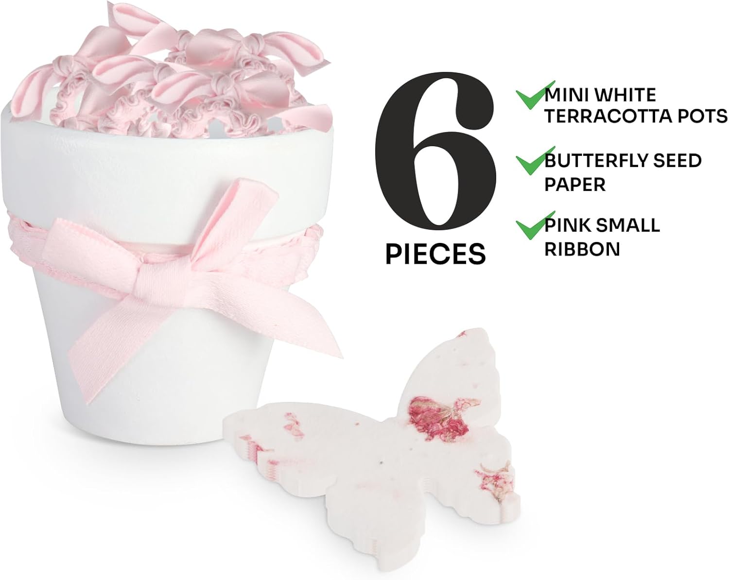 Set of 6 Seed Paper – 6 Pink Butterflies & 6 White Pots with Bow for Baby Shower, Gender Reveal, Birthday, & Other Milestone Celebrations