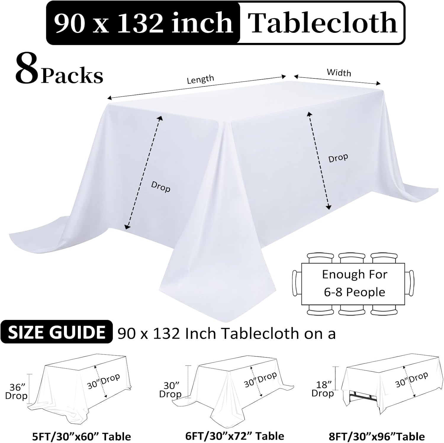 - Measurements and Colors: This white cloth tablecloths is 90" wide and 132" long, perfect for standard 6ft table, providing 30 inch drop, suitable for 6-8 seats. This table cloth rectangle table is available in totally 5 colors. You’ll be able to choose a luxurious and ideal table cover for your table. Please measure the size of your table before purchasing.