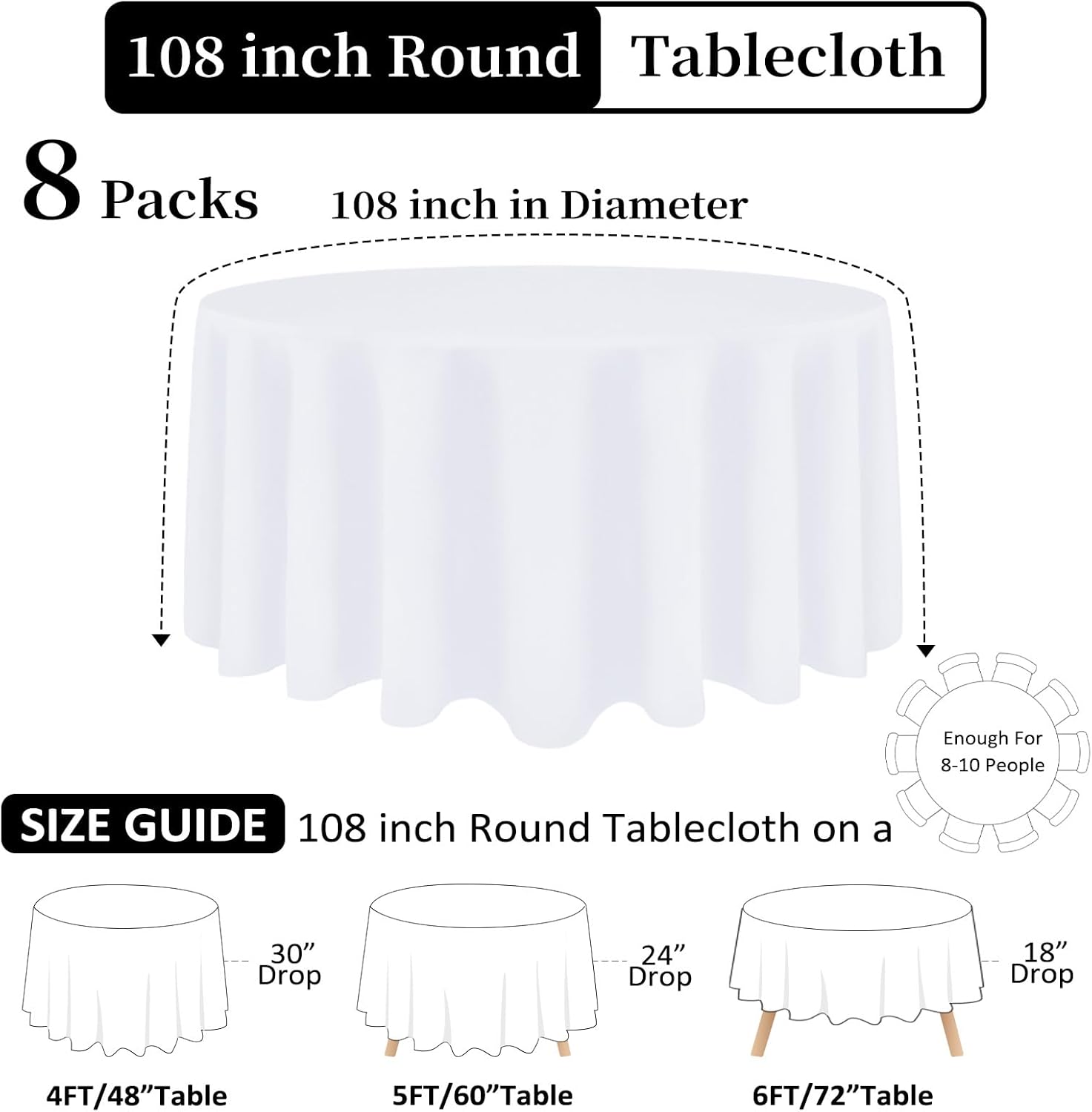 - Measurements and Colors: This white cloth tablecloths is 108 inches in diameter, perfect for standard 6FT(72") round tables, providing a 18" drop, or 24" if your round table is 5FT (60"). This table cloth round cover is available in totally 5 colors. You’ll be able to choose a luxurious and ideal table cover for your table. Please measure the size of your table before purchasing.