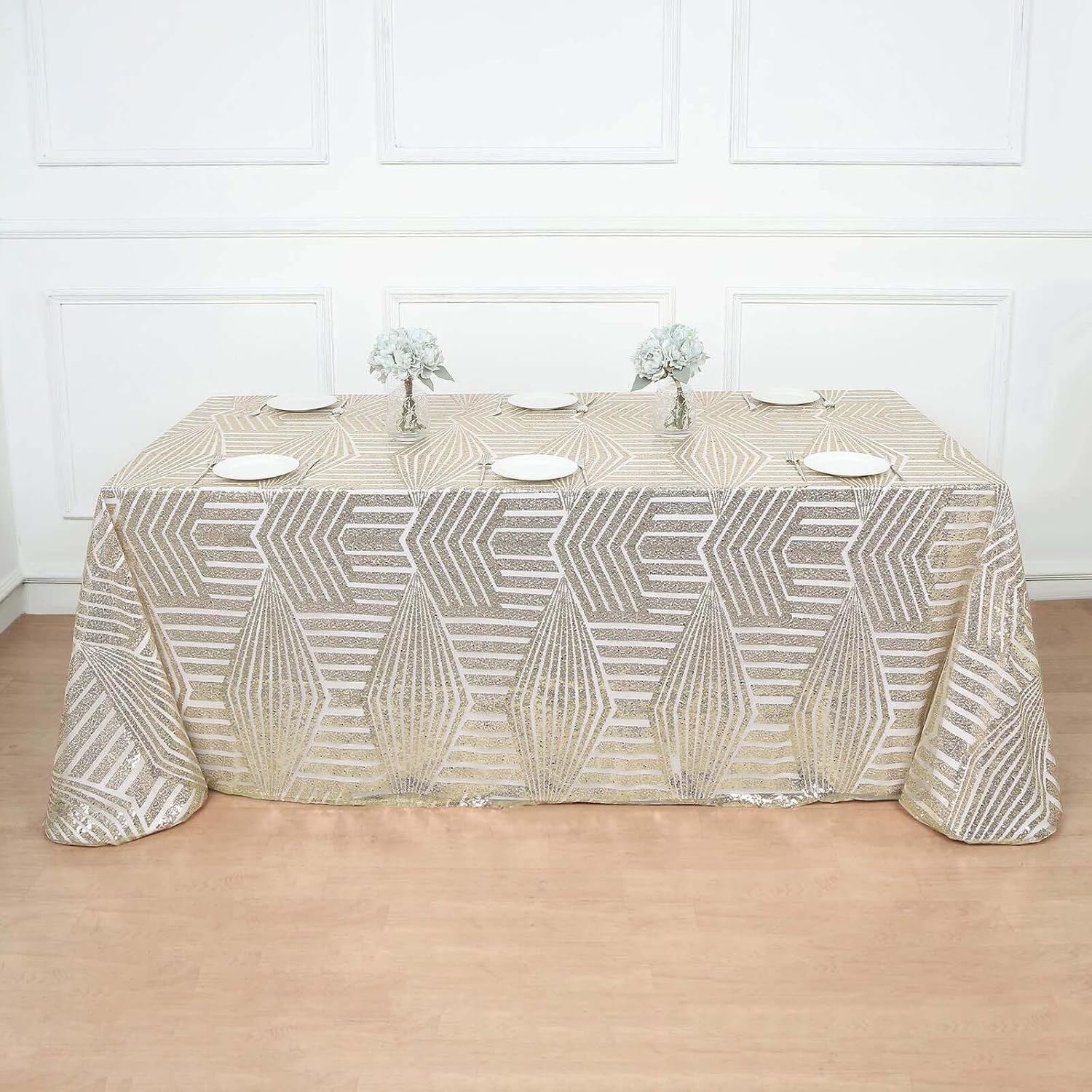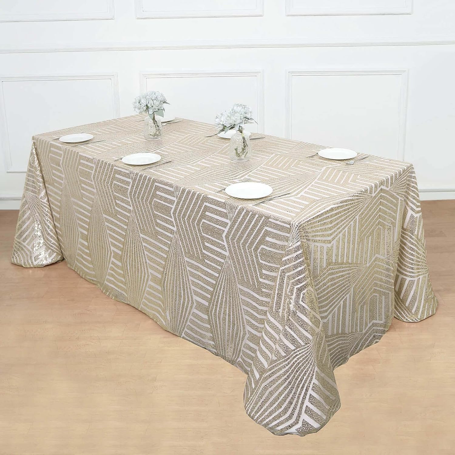 - Quantity: 1 Rectangle Tablecloth Material: Shiny Sequin Beads atop Tulle Net Fabric Color: Champagne Style: Geometric Lines Pattern Size: 90" x 132" Edges: Hemmed Seamless 1pc Design Gives floor length hang on 6ft (30"x72") rectangle tables