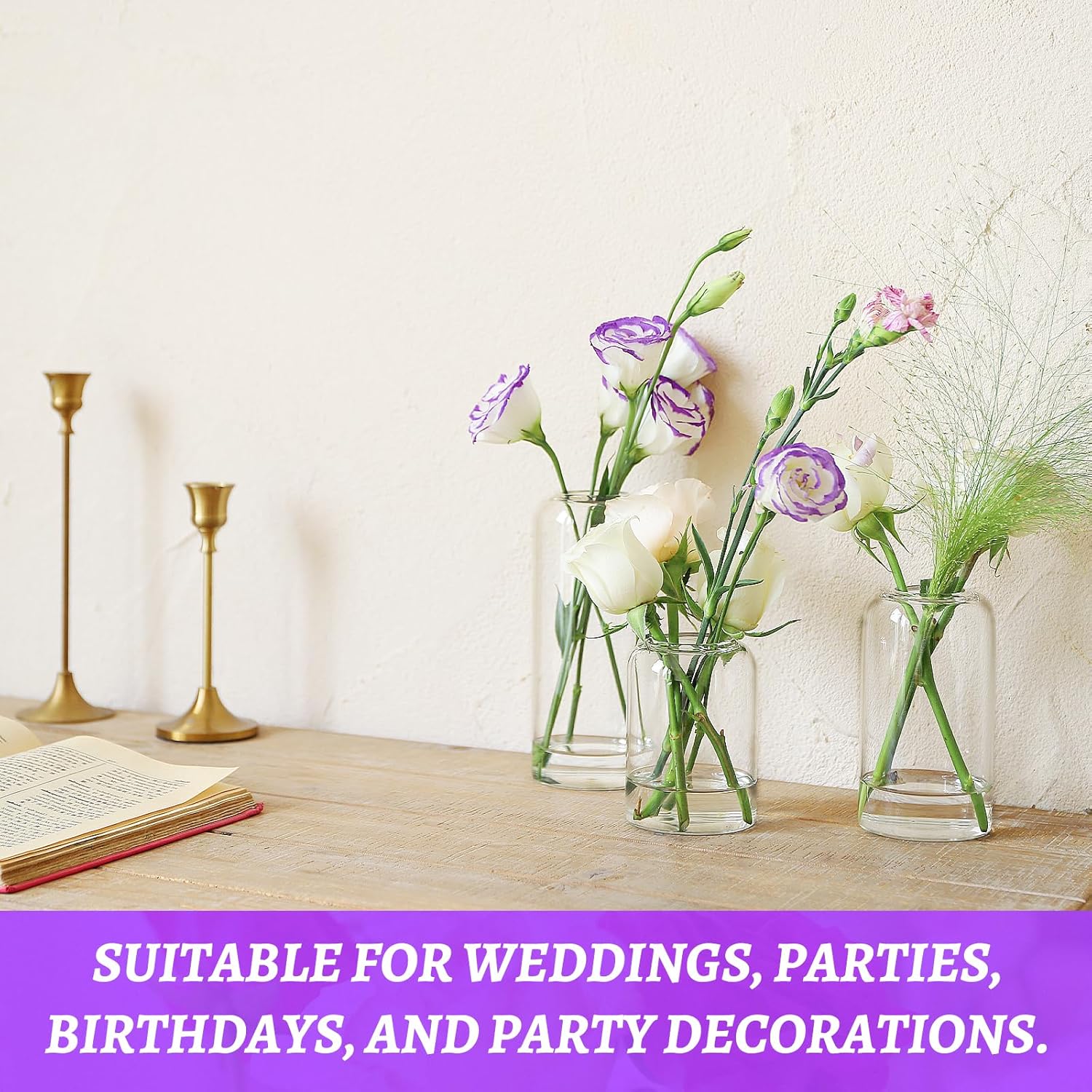 - 🌸Quality & Safety: Clear glass bud vases is made of selected premium thick borosilicate glass,hand-blown to a bright and high transparent finish with durable and sturdy. The top of the vase is smooth with no sharp edges, ensuring safety during the flower arrangement process. Note: Remember to add an appropriate amount of water according to the quantity and weight of the flowers for stability.