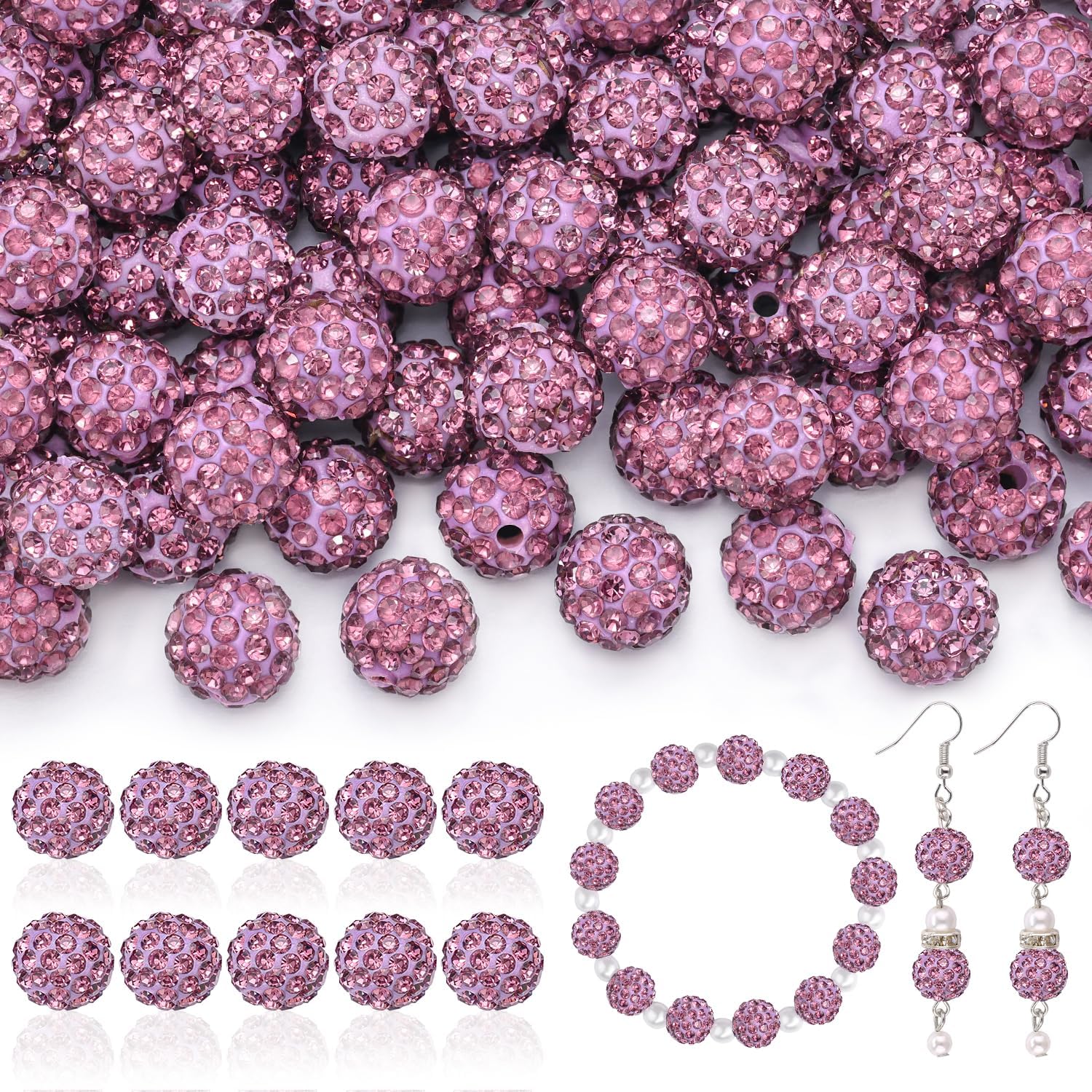 160pcs 10mm Rhinestone Beads for Jewelry Making, Light Purple Shiny Round Disco Beads Bulk, Sparkle Crystal Clay Christmas for Bracelet Baseball Necklace Earring Crafting and DIY