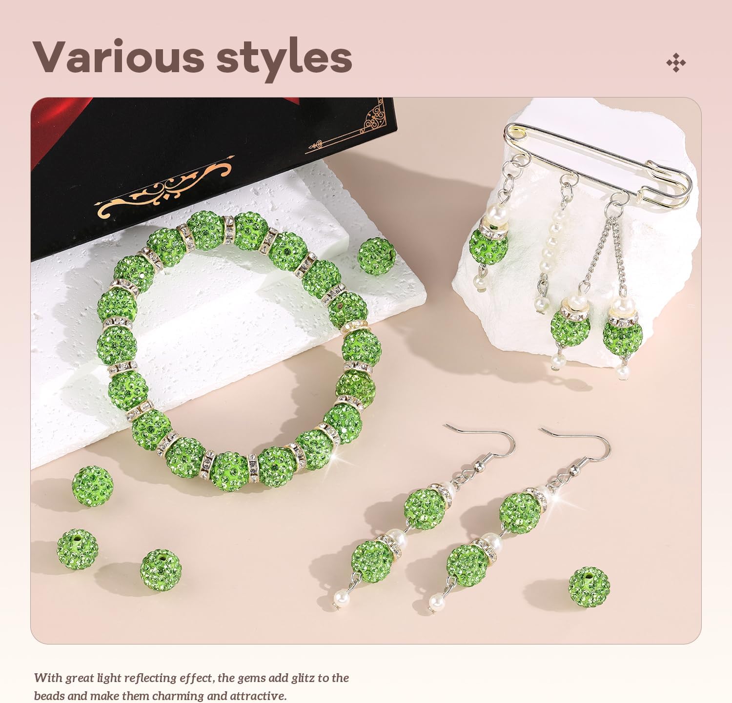 160pcs 10mm Rhinestone Beads for Jewelry Making, Light Green Shiny Round Disco Ball Beads Bulk, Sparkle Crystal Clay Christmas for Bracelet Baseball Necklace Earring Crafting and DIY