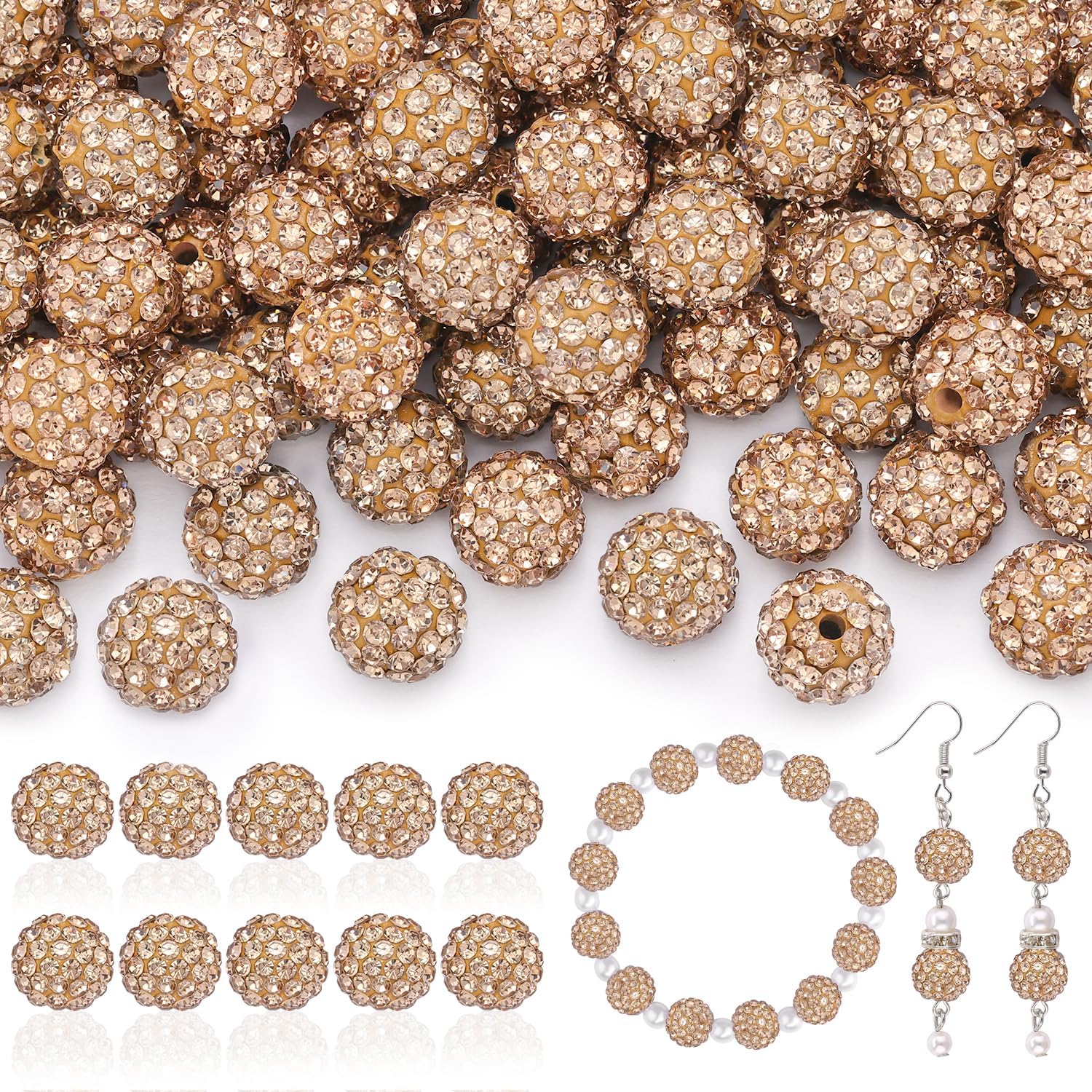 105pcs 10mm Rhinestone Beads for Jewelry Making, Light Brown Shiny Round Disco Ball Beads Bulk, Sparkle Crystal Clay Christmas for Bracelet Baseball Necklace Earring Crafting and DIY
