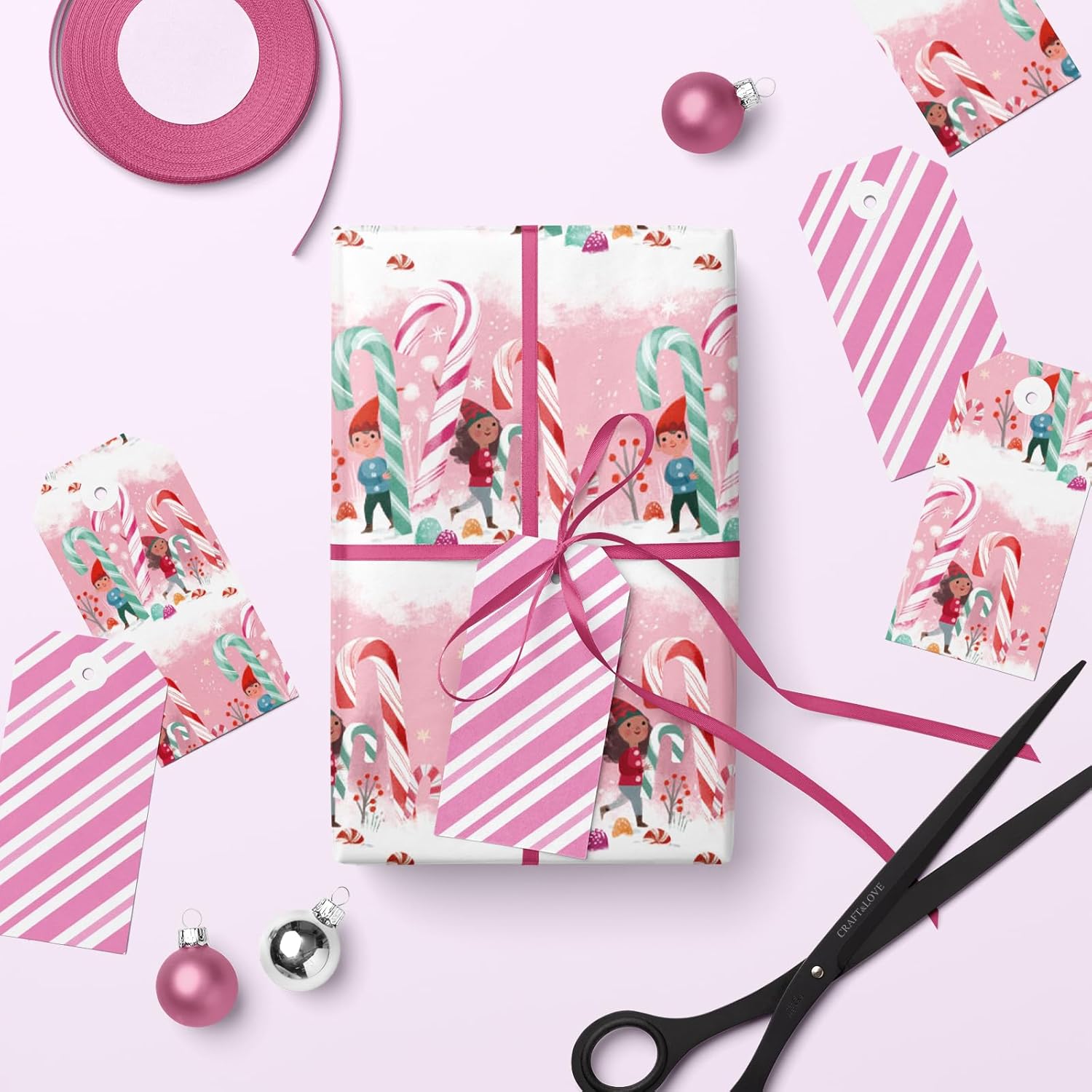 - Sweet & Whimsical Design: Features two festive designs in one roll—front side showcases playful kids, giant candy canes, and a snowy pink background; reverse side has vibrant pink-and-white candy stripes for a modern twist.