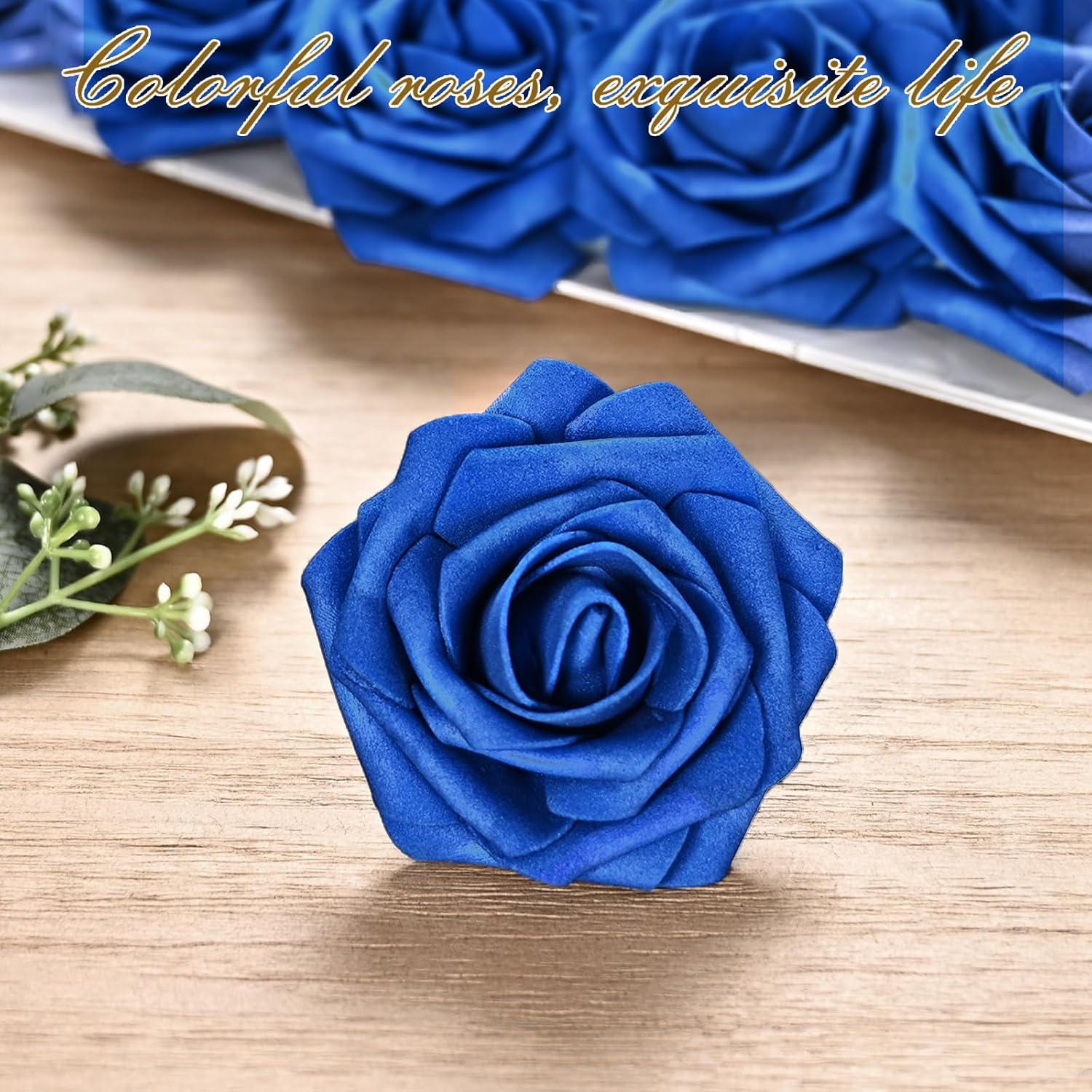 BLEUM CADE 16Pcs Artificial Flowers Fake Roses with Stems, Royal Blue Boxed Foam Roses for DIY Bouquets Centerpieces Wedding Party Arrangement Bridal Shower Decor