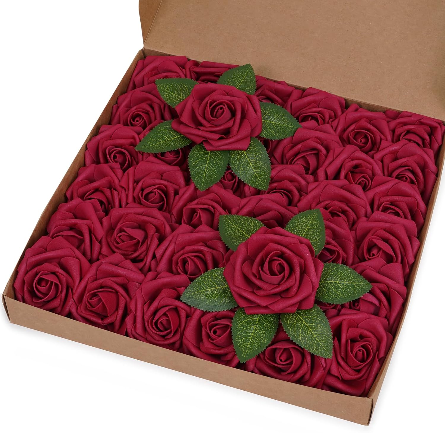 BLEUM CADE 36Pcs Artificial Flowers Fake Roses with Stems, Burgundy Boxed Foam Roses for DIY Bouquets Centerpieces Wedding Party Arrangement Bridal Shower Decor