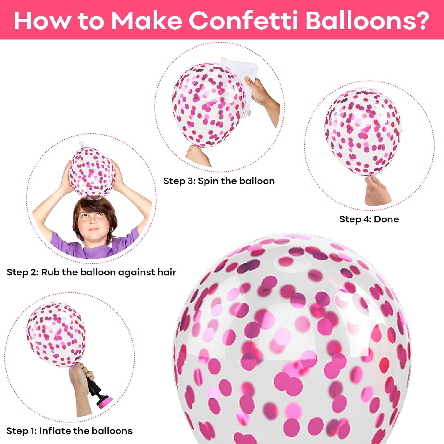 - ๐ How to make Glitter Balloons Confetti: For your convenience, our pink glitter balloons are pre-filled with sparkly confetti. After blowing up the magenta confetti balloons, you can just rub the pink birthday balloons for girls on your hair, towel or something similar to help the confetti stick to the balloon easily. Create a romantic scene at your party as you pink sprinkle confetti balloons all over the place, then enjoy your happy time.