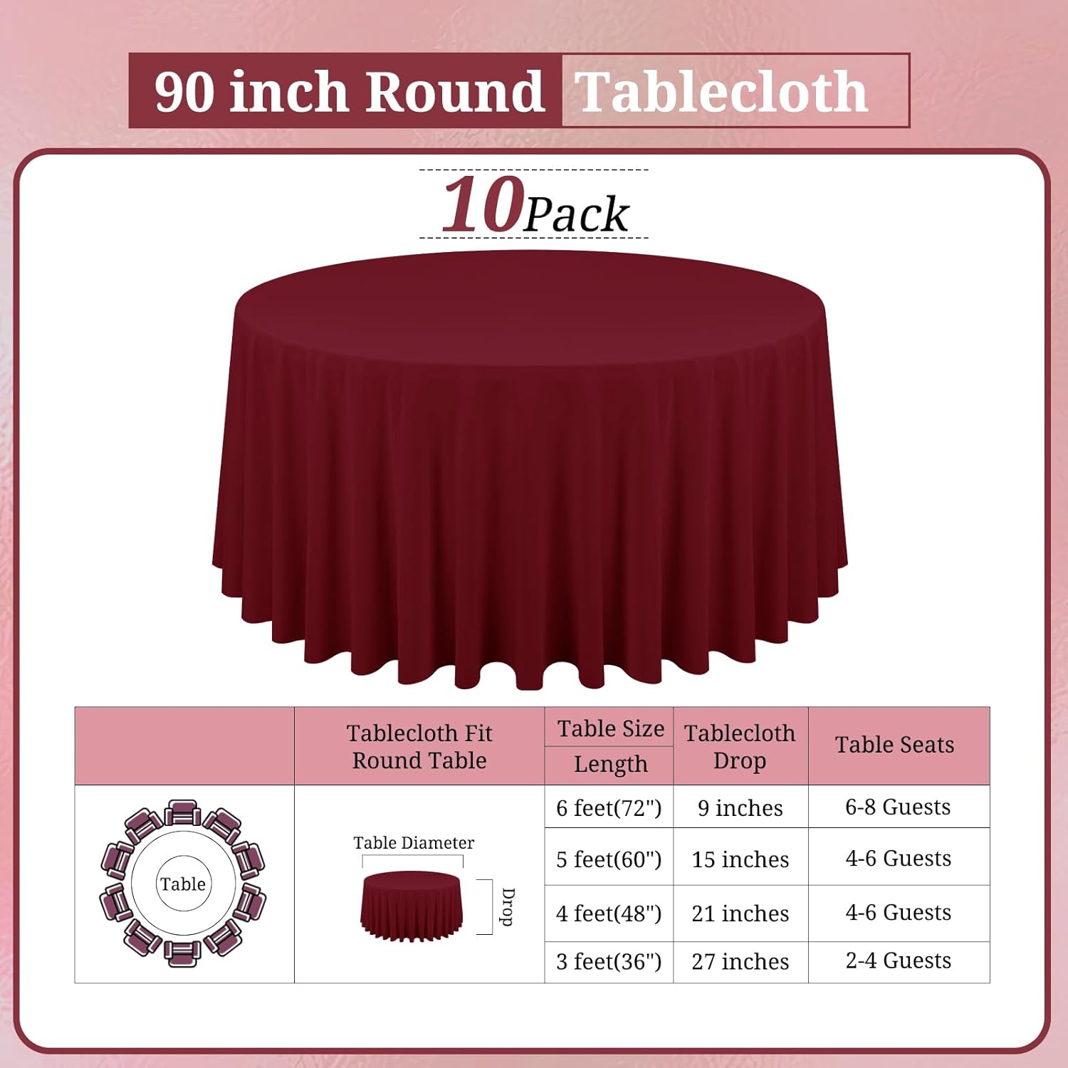 - 【Superior Tablecloth Material】: You will get 10 pack burgundy round tablecloth, this durable and easy to clean tablecloth is made from premium polyester fabric that resists wrinkling for an always crisp, polished look. Providing more convenience for your using and cleaning. Durable for repeat use.