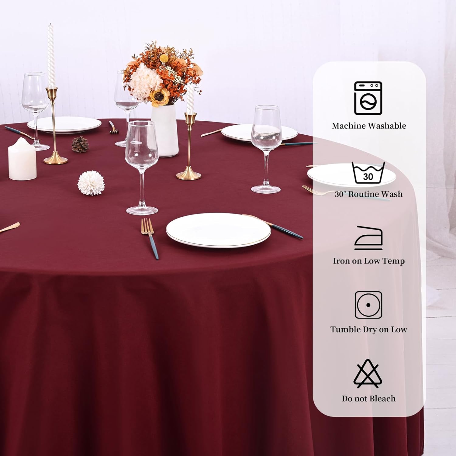 - 【Perfect size】: This burgundy table cloth diameter is 90 inch, cut entirely from a single piece of fabric. Burgundy tablecover is more luxurious, classic and gracious, ideal for both formal & casual settings and makes a great gift for all occasions.Upgrade your special moment and daily life with an exquisite taste.