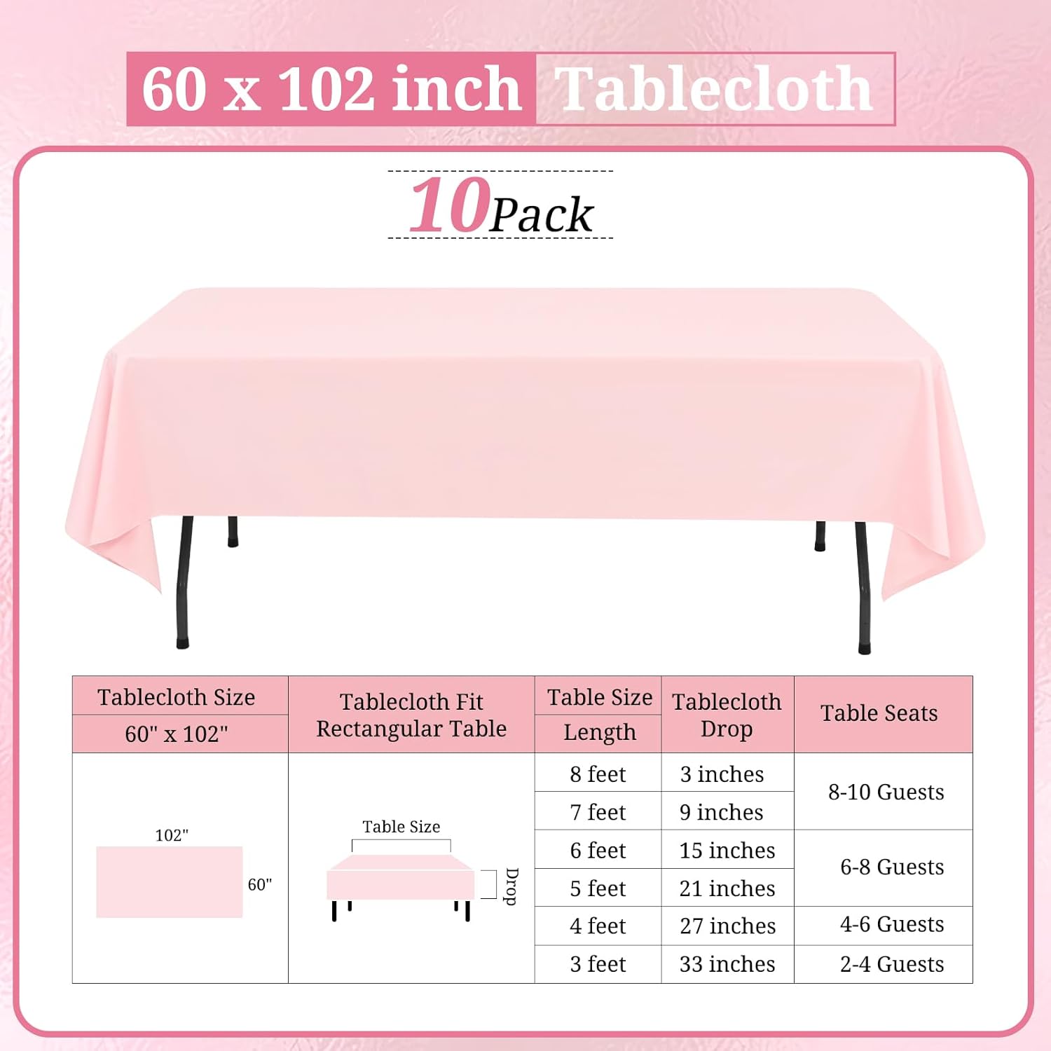- 【Perfect size】: This pink table cloth is 60 inch wide and 102 inch long, cut entirely from a single piece of fabric, perfect for standard 6ft table, providing 15 inch drop. Pink tablecover is more luxurious, classic and gracious, ideal for both formal & casual settings and makes a great gift for all occasions.Upgrade your special moment and daily life with an exquisite taste.